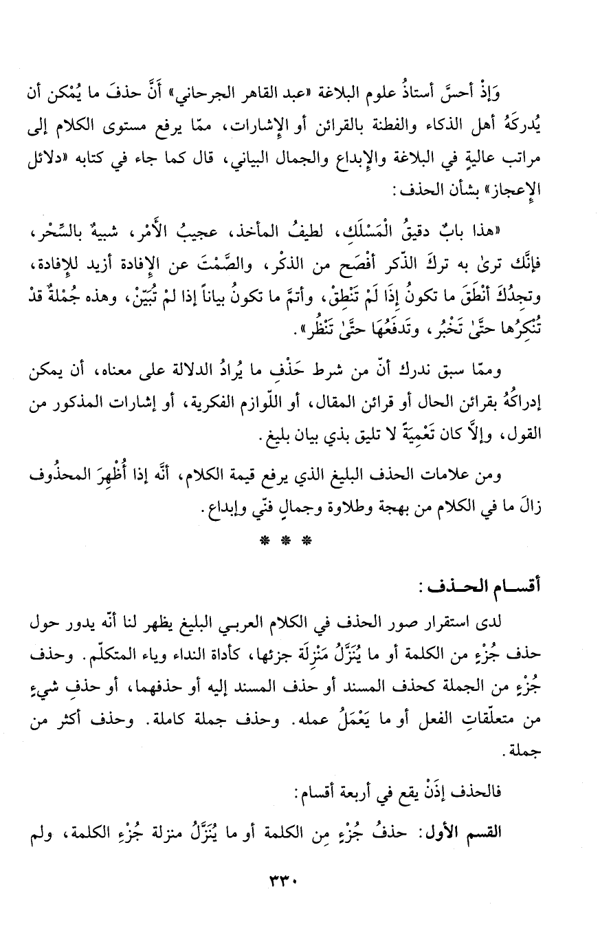 وَإِذْا أحسَّ أستاذُ علوم البلاغة "عبد القاهر الجرحاني" أَنَّ حذفَ ما يُمْكن أن يُدركَهُ أهل الذكاء والفطنة بالقرائن أو الإِشارات، ممّا يرفع مستوى الكلام إلى مراتب عاليةٍ في البلاغة والإِبداع والجمال البياني، قال كما جاء كتابه "دلائل الإعجاز" بشأن الحذف: