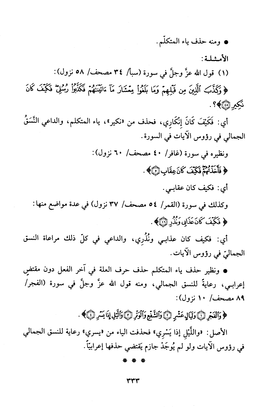 * ونظير حذف ياء المتكلم حذف حرف العلة في آخر الفعل دون مقتضٍ إعرابي، رعايةً للنسق الجمالي، ومنه قول الله عزَّ وجلَّ في سورة (الفجر/ 89 مصحف/ 10 نزول) :