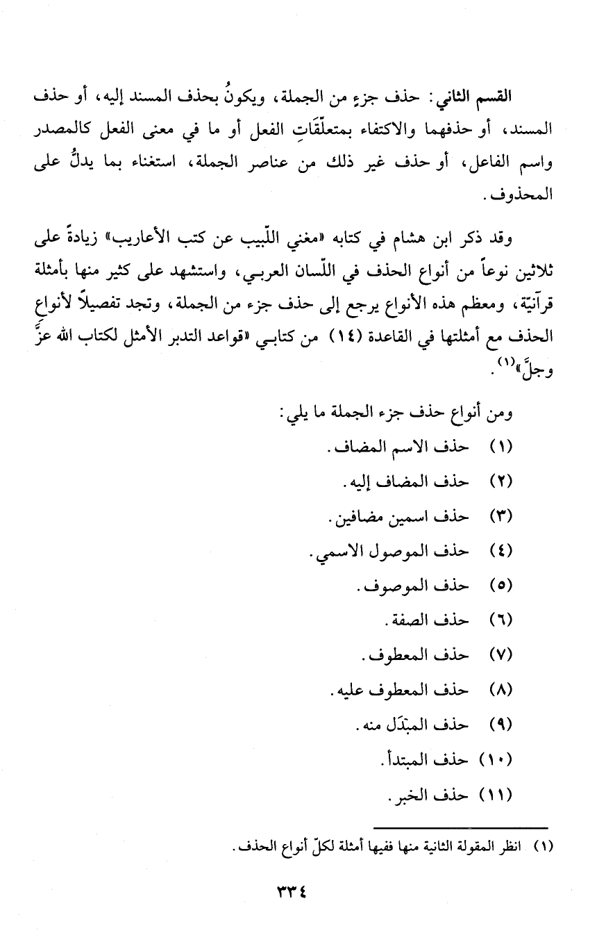 وقد ذكر ابن هشام في كتابه "مغني اللّبيب عن كتب الأعاريب" زيادةً على ثلاثين نوعاً من أنواع الحذف في اللّسان العربي، واستشهد على كثير منها بأمثلة قرآنيّة، ومعظم هذه الأنواع يرجع إلى حذف جزء من الجملة، وتجد تفصيلاً لأنواعِ الحذف مع أمثلتها في القاعدة (14) من كتابي "قواعد التدبر الأمثل لكتاب الله عزَّ وجلَّ".