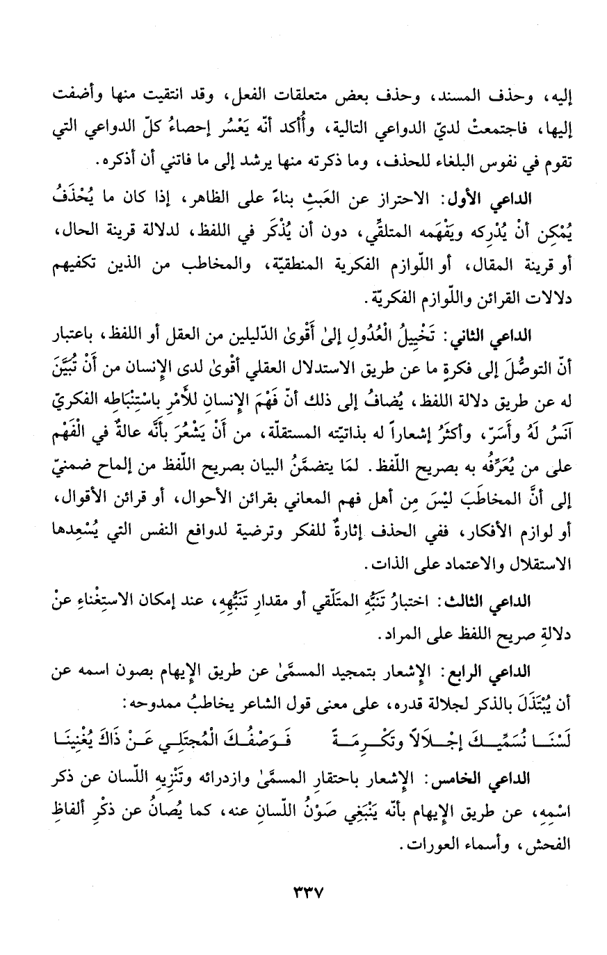 الداعي الأول: الاحتراز عن العَبثِ بناءً على الظاهر، إذا كان ما يُحْذَفُ يُمْكِن أنْ يُدْرِكه ويَفْهَمه المتلقِّي، دون أن يُذْكَر في اللفظ، لدلالة قرينة الحال، أو قرينة المقال، أو اللّوازم الفكرية المنطقيّة، والمخاطب من الذين تكفيهم دلالات القرائن واللّوازم الفكريّة.