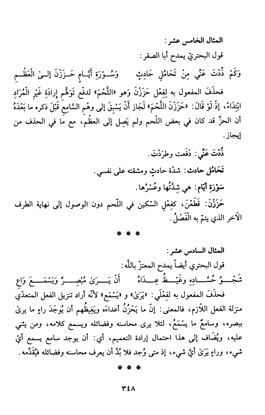 فحذَفَ المفعول به لفِعْلَي: "يَرَى" و"يَسْمَع" لأنّه أراد تنزيل الفعل المتعدّي منزلة الفعل اللاّزم، فالمعنى: إنّ ما يَحْزُنُ أعداءَه ويَغِيظُهم أن يُوجَدَ راءٍ ما يرى ببصره، وسامعٌ ما يسْمَعُ، لئلا يرى محاسنه وفضائله ويسمع كلامه، ومن يثني عليه، ويُضَاف إلى هذا احتمال إرادة التعميم، أي: أن يوجد سامع يسمع أيّ شيء، وراءٍ يَرَى أيَّ شيء، إذ متى وُجد فلا بُدَّ أن يعرف محاسنه وفضائله فيُقَدِّمه.