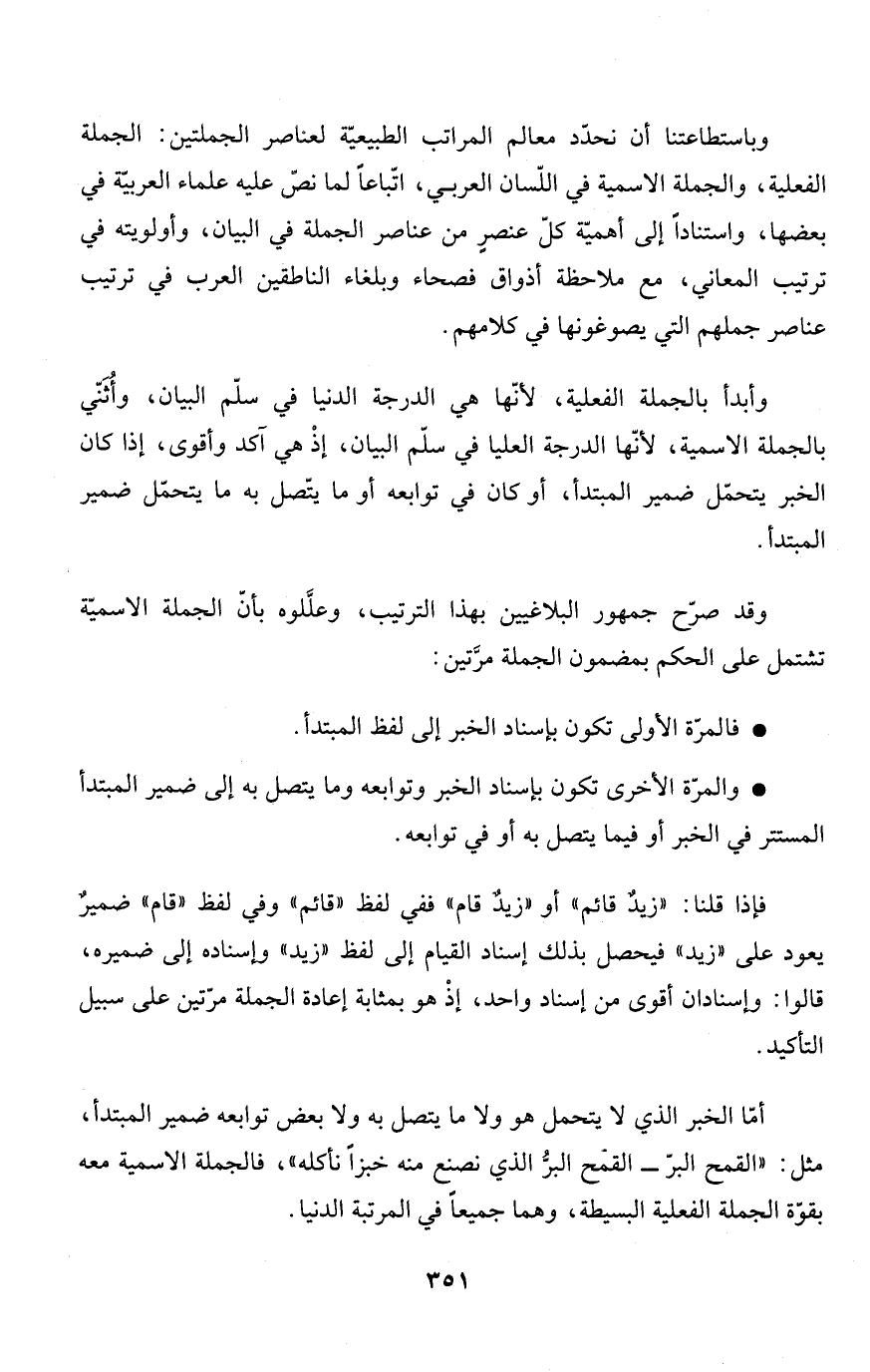 وباستطاعتنا أن نحدّد معالم المراتب الطبيعيّة لعناصر الجملتين: الجملة الفعلية، والجملة الاسمية في اللّسان العربي، اتّباعاً لما نصّ عليه علماء العربيّة في بعضها، واستناداً إلى أهميّة كلّ عنصرٍ من عناصر الجملة في البيان، وأولويته في ترتيب المعاني، مع ملاحظة أذواق فصحاء وبلغاء الناطقين العرب في ترتيب عناصر جملهم التي يصوغونها في كلامهم.