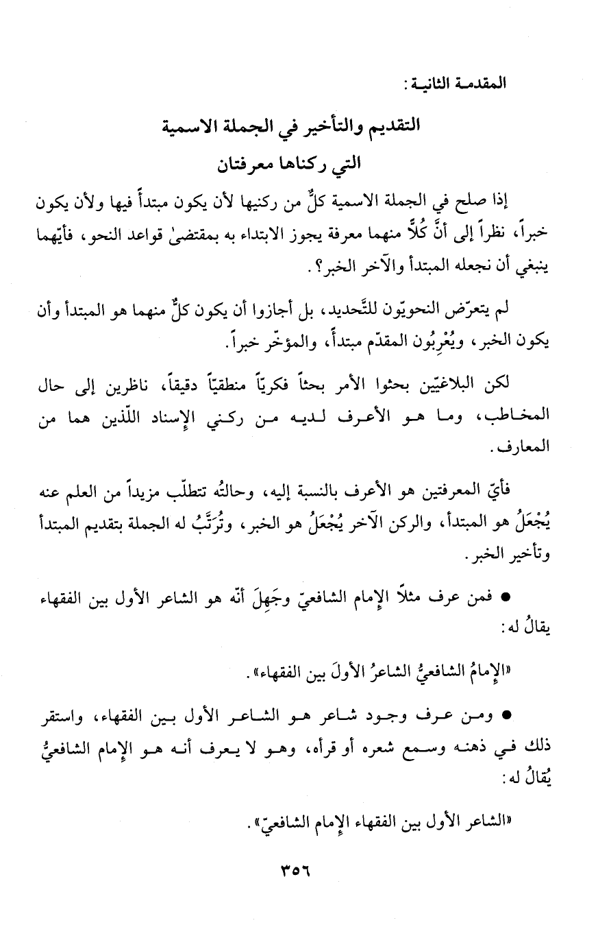 إذا صلح في الجملة الاسمية كلٌّ من ركنيها لأن يكون مبتدأً فيها ولأنّ يكون خبراً، نظراً أنَّ كُلاًّ منهما معرفة يجوز الابتداء به بمقتضى قواعد النحو، فأيّهما ينبغي أن نجعله المبتدأ والآخر الخبر؟.