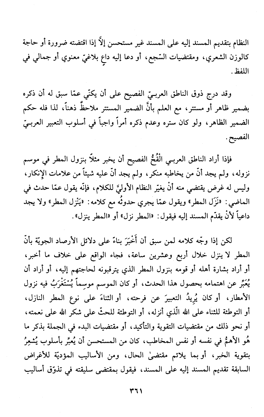 فإذا أراد الناطق العربي الْقُحُّ الفصيح أن يخبر مثلاً بنزول المطر في موسم نزوله، ولم يجد أنّ من يخاطبه منكر، ولم يجد أنّ عليه شيئاً من علامات الإِنكار، وليس من غرض يقتضي منه أنْ يغيّر النظام الأوليَّ للكلام، فإنّه يقول عمّا حدث في الماضي: "نَزَل المطر" ويقول عمّا يجري حدوثُه مع كلامه: "يَنْزل المطر" ولا يجد داعياً لأنْ يقدّم المسند إليه فيقول: "المطر نزل" أو "المطر ينزل".