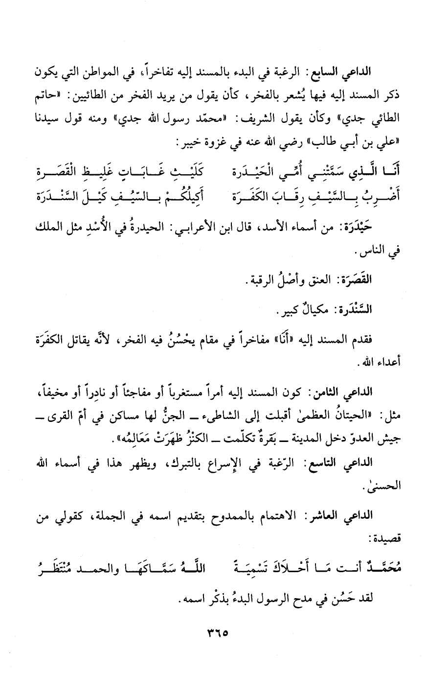 الداعي السابع: الرغبة في البدء بالمسند إليه تفاخراً، في المواطن التي يكون ذكر المسند إليه فيها يُشعر بالفخر، كأن يقول من يريد الفخر من الطائيين: "حاتم الطائي جدي" وكأن يقول الشريف: "محمّد رسول الله جدي" ومنه قول سيدنا "علي بن أبي طالب" رضي الله عنه في غزوة خيبر: