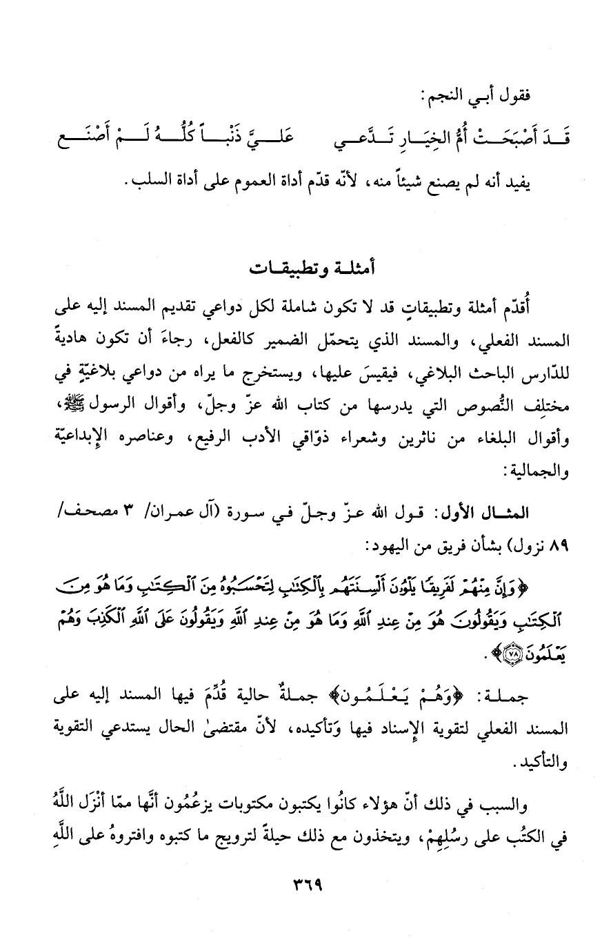 أُقدّم أمثلة وتطبيقاتٍ قد لا تكون شاملة لكل دواعي تقديم المسند إليه على المسند الفعلي، والمسند الذي يتحمّل الضمير كالفعل، رجاءَ أن تكون هاديةً للدّارس الباحث البلاغي، فيقيسَ عليها، ويستخرج ما يراه من دواعي بلاغيّةٍ في مختلِف النُّصوص التي يدرسها من كتاب الله عزّ وجلّ، وأقوال الرسول صَلَّى اللهُ عَلَيْهِ وَسَلَّمَ، وأقوال البلغاء من ناثرين وشعراء ذوّاقي الأدب الرفيع، وعناصره الإِبداعيّة والجمالية: