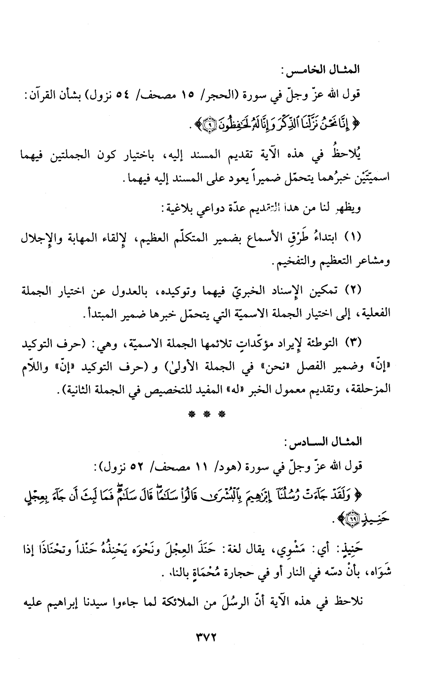 (3) التوطئة لإِيراد مؤكّداتٍ تلائمها الجملة الاسميّة، وهي: (حرف التوكيد "إنّ" وضمير الفصل "نحن" في الجملة الأولى) و (حرف التوكيد "إنّ" واللاّم المزحلقة، وتقديم معمول الخبر "له" المفيد للتخصيص في الجملة الثانية) .