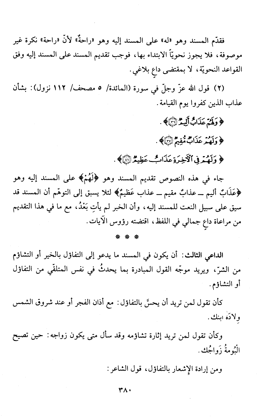 جاء في هذه النصوص تقديم المسند وهو {لَهُمْ} على المسند إليه وهو {عَذابٌ أليم - عذابٌ مقيم - عذاب عَظيمٌ} لئلا يسبق إلى التوهّم أن المسند قد سيق على سبيل النعت للمسند إليه، وأن الخبر لم يأتِ بَعْدُ، مع ما في هذا التقديم من مراعاة داعٍ جمالي في اللفظ، اقتضته رؤوس الآيات.