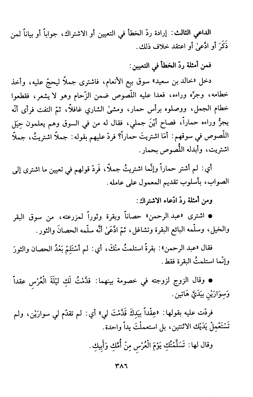 * اشترى "عبد الرحمن" حصاناً وبقرة وثوراً لمزرعته، من سوق البقر والخيل، وسلّمه البائع البقرة وتشاغل، ثمّ ادَّعَى أنَّه سلّمه الحصانَ والثور.