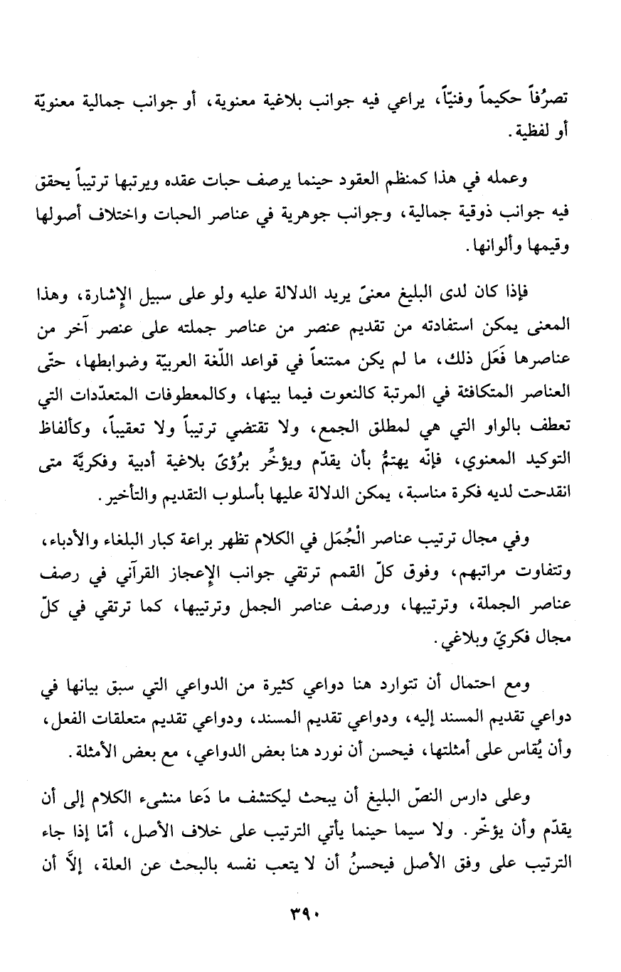 وعلى دارس النصّ البليغ أن يبحث ليكتشف ما دَعا منشىء الكلام إلى أن يقدّم وأن يؤخّر. ولا سيما حينما يأتي الترتيب على خلاف الأصل، أمّا إذا جاء الترتيب على وفق الأصل فيحسنُ أن لا يتعب نفسه بالبحث عن العلة، إلاَّ أن