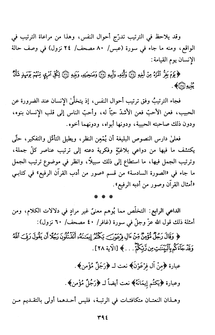 فعلى دارس النصوص البليغة أن يُمْعِن النظر، ويطيل التأمُّل والتفكير، حتَّى يكتشف ما فيها من دواعي بلاغيّةٍ وفكرية دعته إلى ترتيب عناصر كلّ جملة، وترتيب الجمل فيها، ما استطاع إلى ذلك سبيلاً، وانظر في موضوع ترتيب الجمل ما جاء في "الصورة السادسة" من قسم "صور من أدب القرآن الرفيع" في كتابي "أمثال القرآن وصور من أدبه الرفيع".