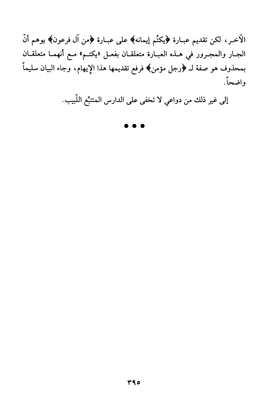 الآخر، لكن تقديم عبارة {يَكْتُمُ إِيمَانَهُ} على عبارة {مِّنْ آلِ فِرْعَوْنَ} يوهم أنّ الجار والمجرور في هذه العبارة متعلقان بفعل "يكتم" مع أنهما متعلقان بمحذوف هو صفة لـ {رَجُلٌ مُّؤْمِنٌ} فرفع تقديمها هذا الإِيهام، وجاء البيان سليماً واضحاً.