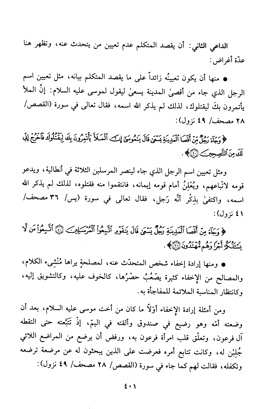 * منها أن يكون تعيينُه زائداً على ما يقصد المتكلم بيانه، مثل تعيين اسم الرجل الذي جاء من أقصى المدينة يسعى ليقول لموسى عليه السلام: إنَّ الملأ يأتمرون بكَ ليقتلوك، لذلك لم يذكر الله اسمه، فقال تعالى في سورة (القصص/ 28 مصحف/ 49 نزول) :