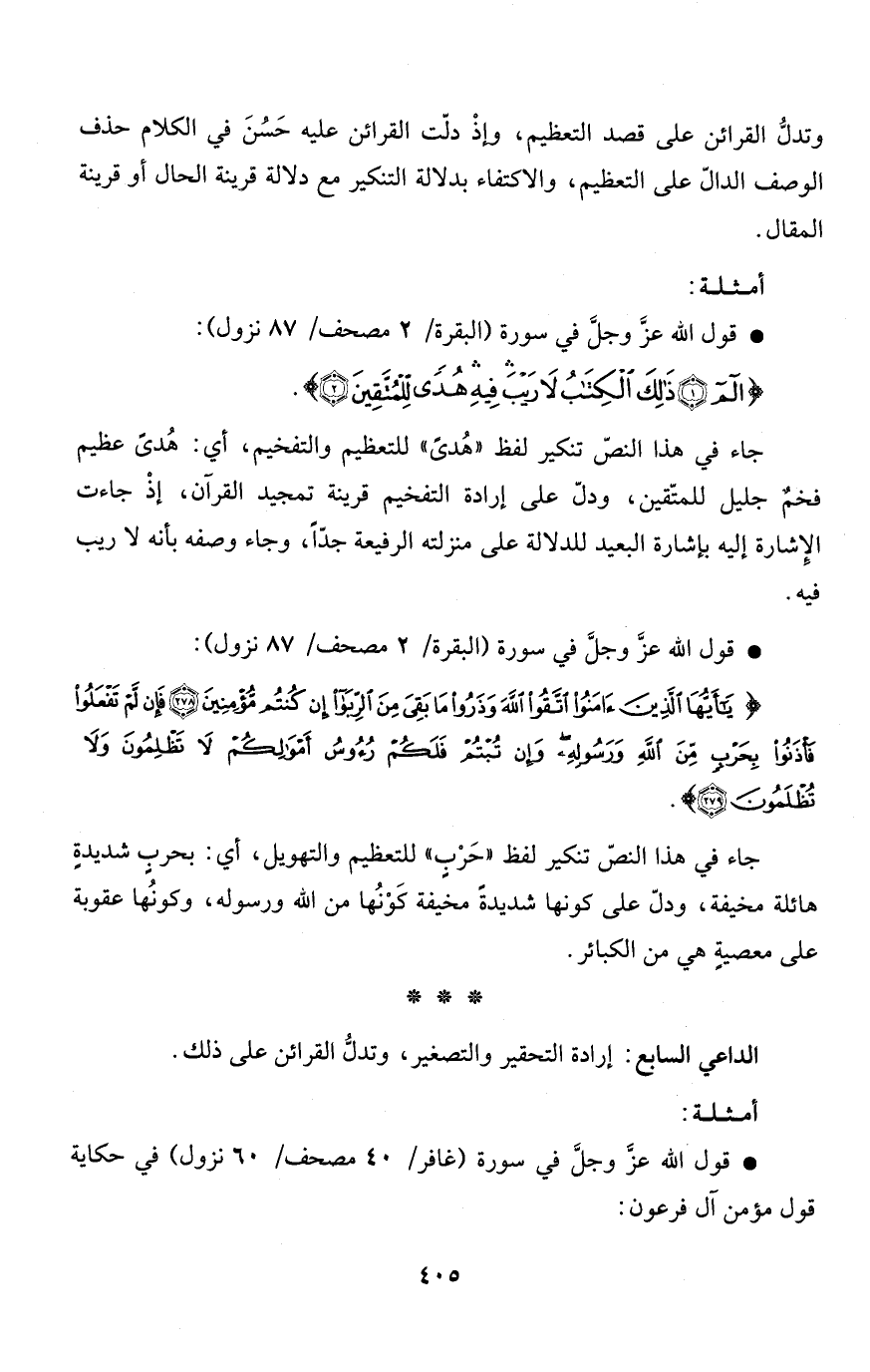 وتدلُّ القرائن على قصد التعظيم، وإذْ دلّت القرائن عليه حَسُنَ في الكلام حذف الوصف الدالّ على التعظيم، والاكتفاء بدلالة التنكير مع دلالة قرينة الحال أو قرينة المقال.
