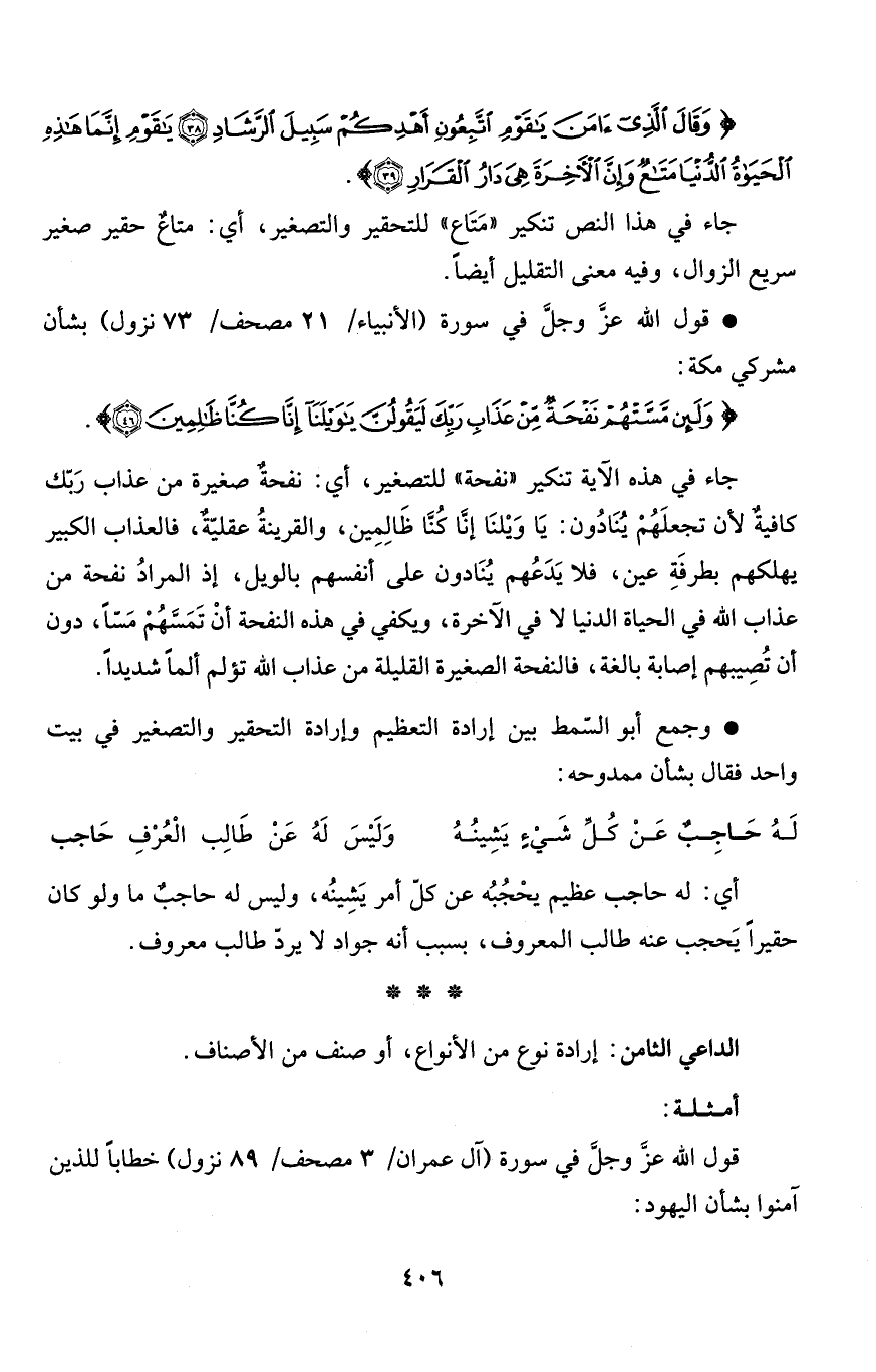 جاء في هذه الآية تنكير "نفحة" للتصغير، أي: نفحةٌ صغيرة من عذاب رَبّك كافيةٌ لأن تجعلَهُمْ يُنَادُون: يَا وَيْلنَا إنَّا كُنَّا ظَالِمِين، والقرينةُ عقليّةٌ، فالعذاب الكبير يهلكهم بطرفَةِ عين، فلا يَدَعُهم يُنَادون على أنفسهم بالويل، إذ المرادُ نفحة من عذاب الله في الحياة الدنيا لا في الآخرة، ويكفي في هذه النفحة أنْ تَمَسَّهُمْ مَسّاً، دون أن تُصِيبهم إصابة بالغة، فالنفحة الصغيرة القليلة من عذاب الله تؤلم ألماً شديداً.
