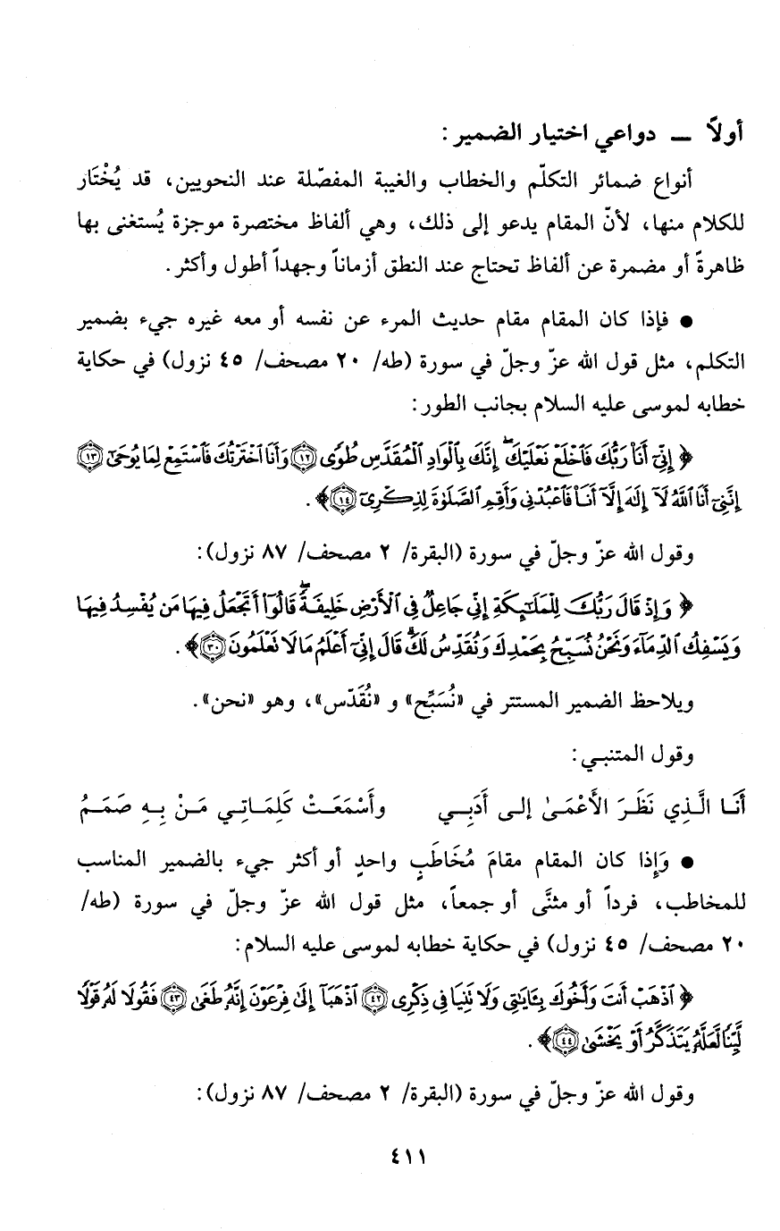 * فإذا كان المقام مقام حديث المرء عن نفسه أو معه غيره جيء بضمير التكلم، مثل قول الله عزّ وجلّ في سورة (طه/ 20 مصحف/ 45 نزول) في حكاية خطابه لموسى عليه السلام بجانب الطور: