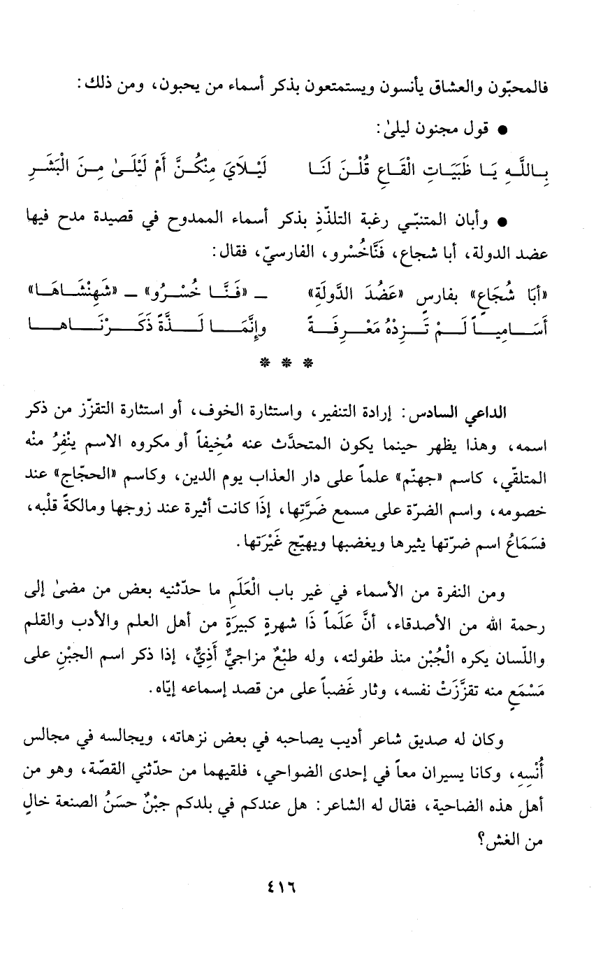 * وأبان المتنبّي رغبة التلذّدِ بذكر أسماء الممدوح في قصيدة مدح فيها عضد الدولة، أبا شجاع، فَنَّاخُسْرو، الفارسيّ، فقال: