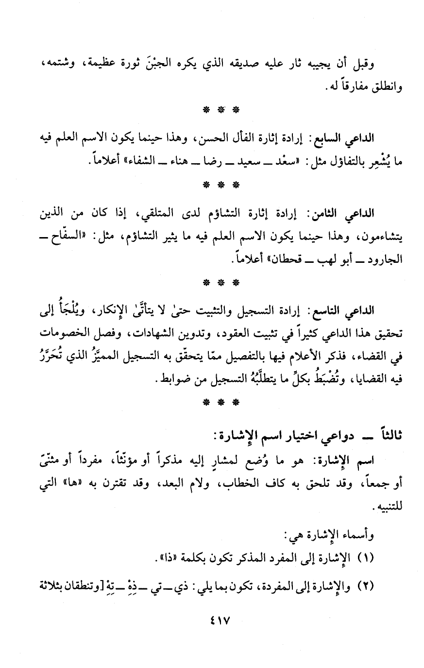 الداعي السابع: إرادة إثارة الفأل الحسن، وهذا حينما يكون الاسم العلم فيه ما يُشْعِر بالتفاؤل مثل: "سعْد - سيعد - رضا - هناء - الشفاء" أعلاماً.