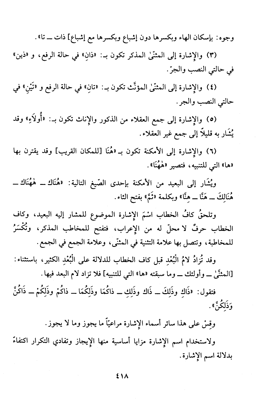 (6) والإِشارة إلى الأمكنة تكون بـ "هُنَا [للمكان القريب] وقد يقترن بها "ها" التي للتنبيه، فتصير "هاهنا" ويُشَار إلى البعيد من الأمكنة بإحدى الصّيغ التالية: "هُنَاك - هاهناك - هُنَالِكَ - هَنَّا - هِنَّا" وبكلمة "ثَمَّ" بفتح الثاء.