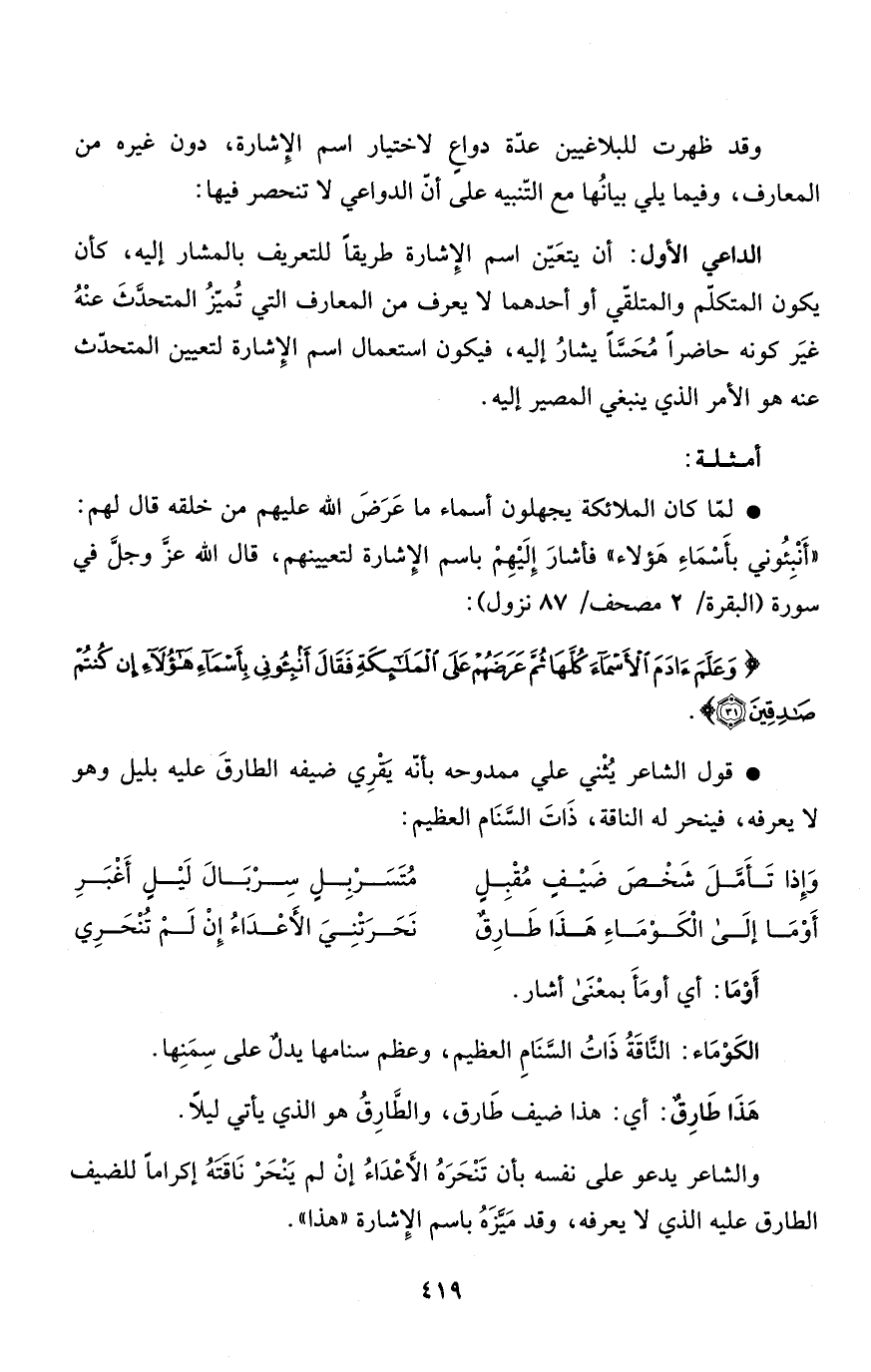 * قول الشاعر يُثْني علي ممدوحه بأنّه يَقْرِي ضيفه الطارقَ عليه بليل وهو لا يعرفه، فينحر له الناقة، ذَاتَ السَّنَام العظيم: