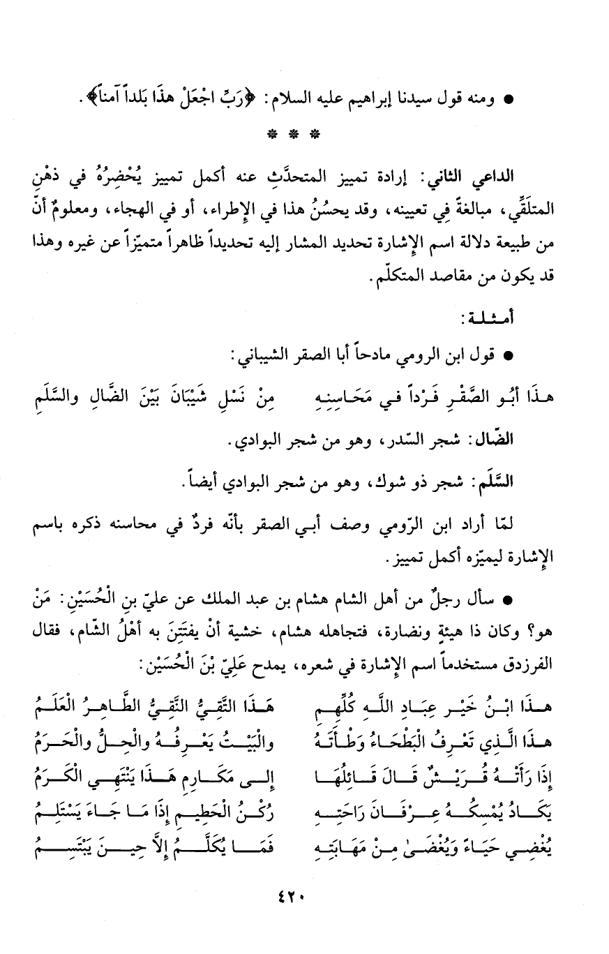 لمّا أراد ابن الرّومي وصف أبي الصقر بأنّه فردٌ في محاسنه ذكره باسم الإِشارة ليميّزه أكمل تمييز.