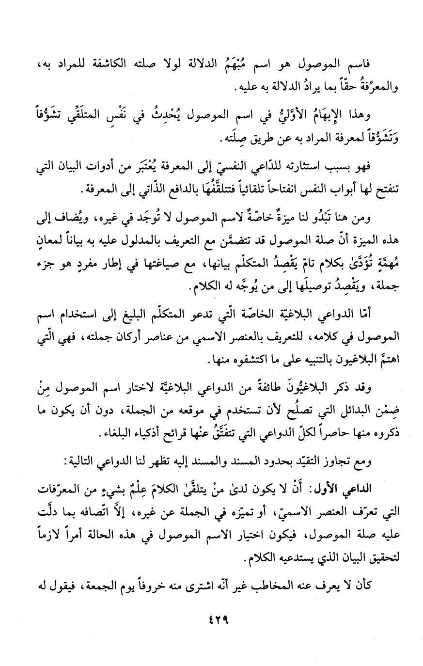 الداعي الأول: أَنْ لا يكون لدى منْ يتلقَّى الكلامَ عِلْمٌ بشيءٍ من المعرّفات التي تعرّف العنصر الاسميّ، أو تميّزه في الجملة عن غيره، إلاَّ اتّصافه بما دلَّت عليه صلة الموصول، فيكون اختيار الاسم الموصول في هذه الحالة أمراً لازماً لتحقيق البيان الذي يستدعيه الكلام.