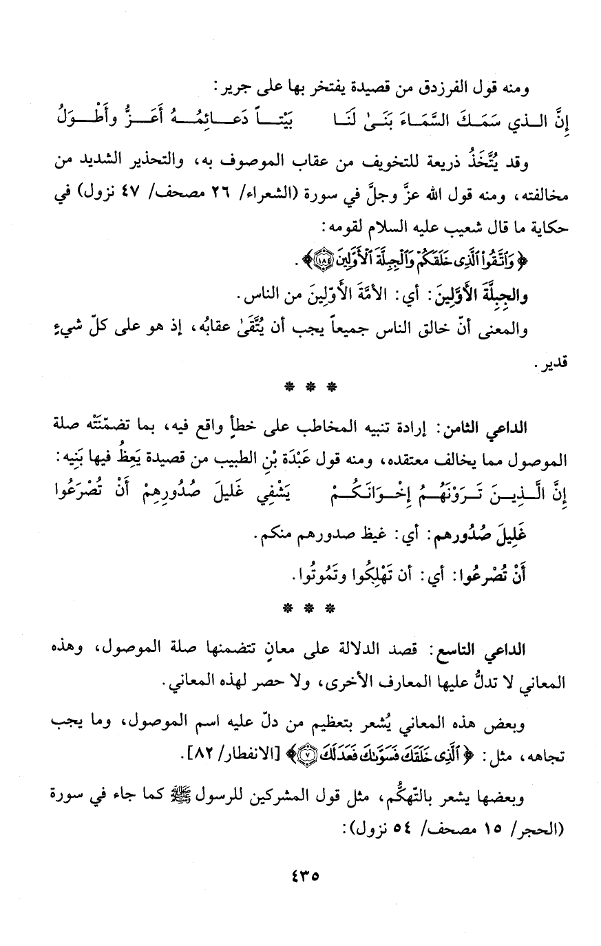 الداعي التاسع: قصد الدلالة على معانٍ تتضمنها صلة الموصول، وهذه المعاني لا تدلُّ عليها المعارف الأخرى، ولا حصر لهذه المعاني.