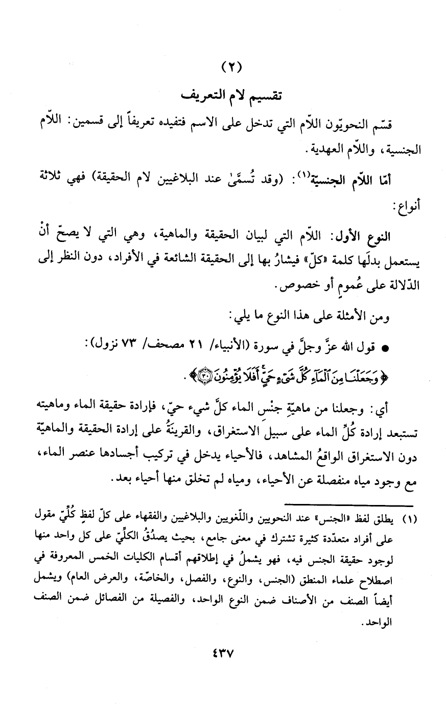 النوع الأول: اللاّم التي لبيان الحقيقة والماهية، وهي التي لا يصحّ أنْ يستعمل بدلَها كلمة "كلّ" فيشارُ بها إلى الحقيقة الشائعة في الأفراد، دون النظر إلى الدّلالة على عُمومٍ أو خصوص.