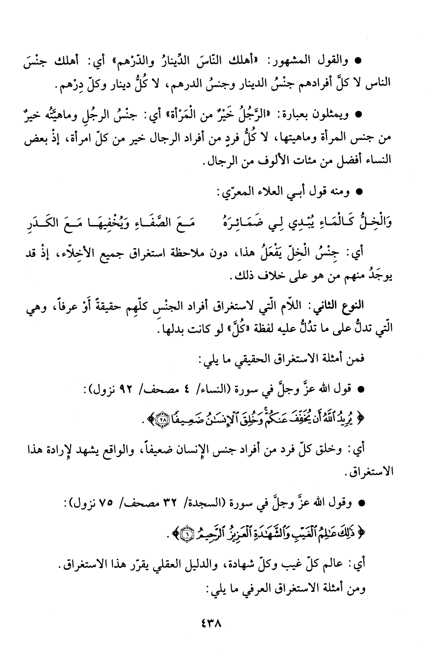 * ويمثلون بعبارة: "الرَّجُلُ خَيْرٌ من الْمَرْأة" أي: جنْسُ الرجُلِ وماهيَّتُه خيرٌ من جنس المرأة وماهيتها، لا كُلُّ فردٍ من أفراد الرجال خير من كلّ امرأة، إذْ بعض النساء أفضل من مئات الألوف من الرجال.