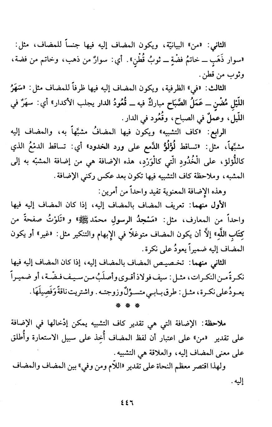 الثالث: "في" الظرفية، ويكون المضاف إليه فيها ظرفاً للمضاف مثل: "سَهَرُ اللّيْلِ مُضْنٍ - عَمَلُ الصَّبَاح مباركٌ فيه - قُعُودُ الدار يجلب الأكدار" أي: سَهرٌ في اللّيل، وعملٌ في الصباح، وقُعُود في الدار.