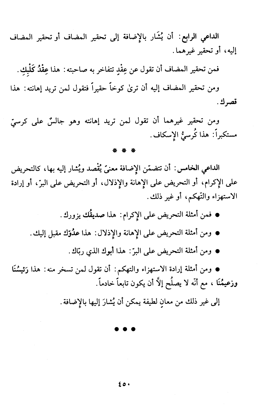 الداعي الخامس: أن تتضمّن الإِضافة معنىً يُقْصد ويُشار إليه بها، كالتحريض على الإِكرام، أو التحريض على الإِهانة والإِذلال، أو التحريض على البرّ، أو إرادة الاستهزاء والتّهكم، أو غير ذلك.