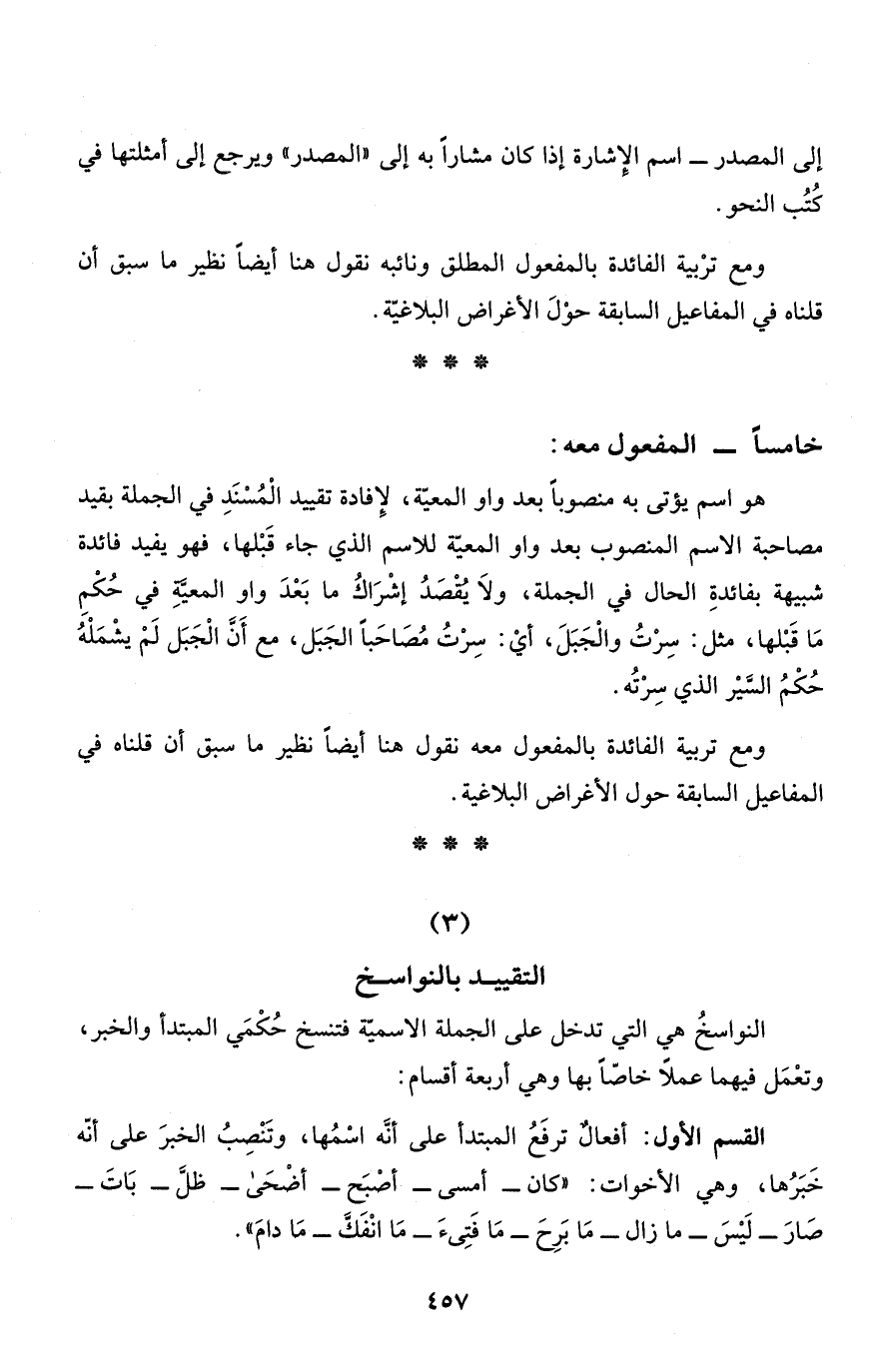 القسم الأول: أفعالٌ ترفَعُ المبتدأ على أنَّه اسْمُها، وتَنْصِبُ الخبرَ على أنّه خَبَرُها، وهي الأخوات: "كان - أمسى - أصْبَح - أضْحَى - ظلَّ - بَاتَ - صَارَ - لَيْسَ - ما زال - مَا بَرِحَ - مَا فَتِىءَ - مَا انْفَكَّ - مَا دامَ".