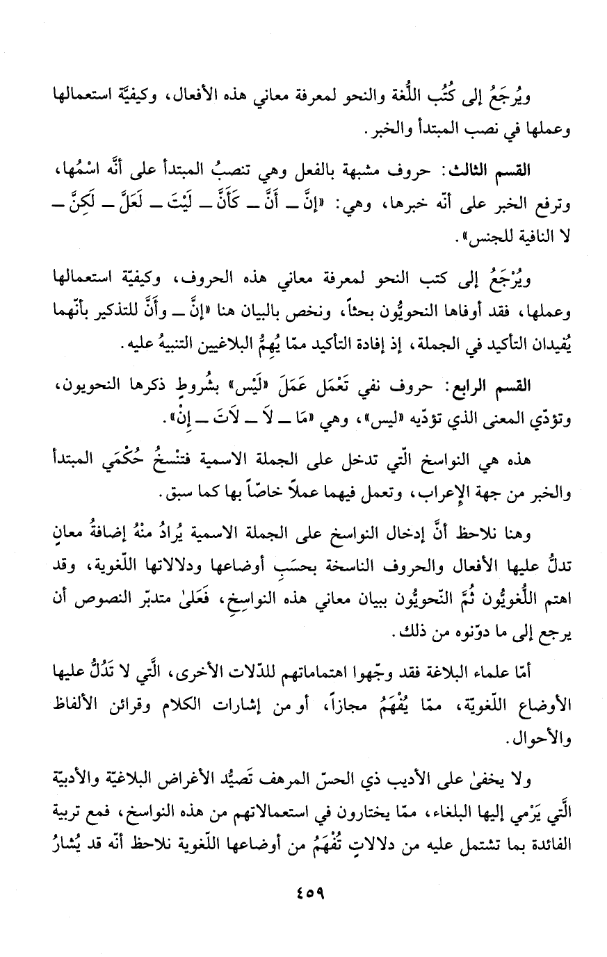 هذه هي النواسخ الّتي تدخل على الجملة الاسمية فتنْسخُ حُكْمَي المبتدأ والخبر من جهة الإِعراب، وتعمل فيها عملاً خاصّاً بها كما سبق.