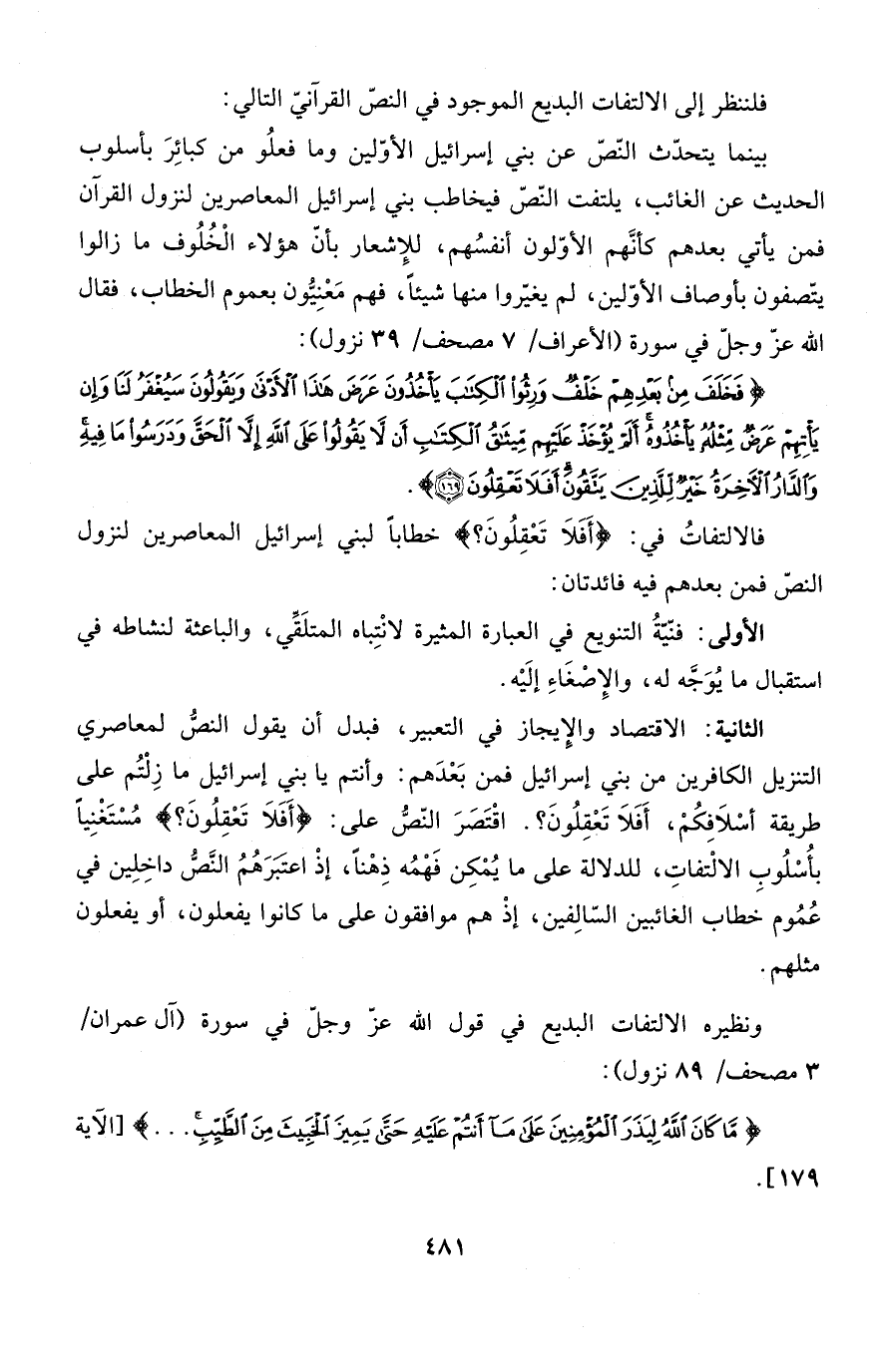 الثانية: الاقتصاد والإِيجاز في التعبير، فبدل أن يقول النصُّ لمعاصري التنزيل الكافرين من بني إسرائيل فمن بَعْدَهم: وأنتم يا بني إسرائيل ما زِلْتُم على طريقة أسْلاَفِكُمْ، أَفَلاَ تَعْقِلُونَ؟. اقْتَصَرَ النّصُّ على: {أَفَلاَ تَعْقِلُونَ} مُسْتَغْنِياً بأُسْلُوبِ الالْتفاتِ، للدلالة على ما يُمْكِن فَهْمُه ذِهْناً، إذْ اعتَبَرَهُمُ النَّصُّ داخِلِين في عُمُوم خطاب الغائبين السّالِفين، إذْ هم موافقون على ما كانوا يفعلون، أو يفعلون مثلهم.
