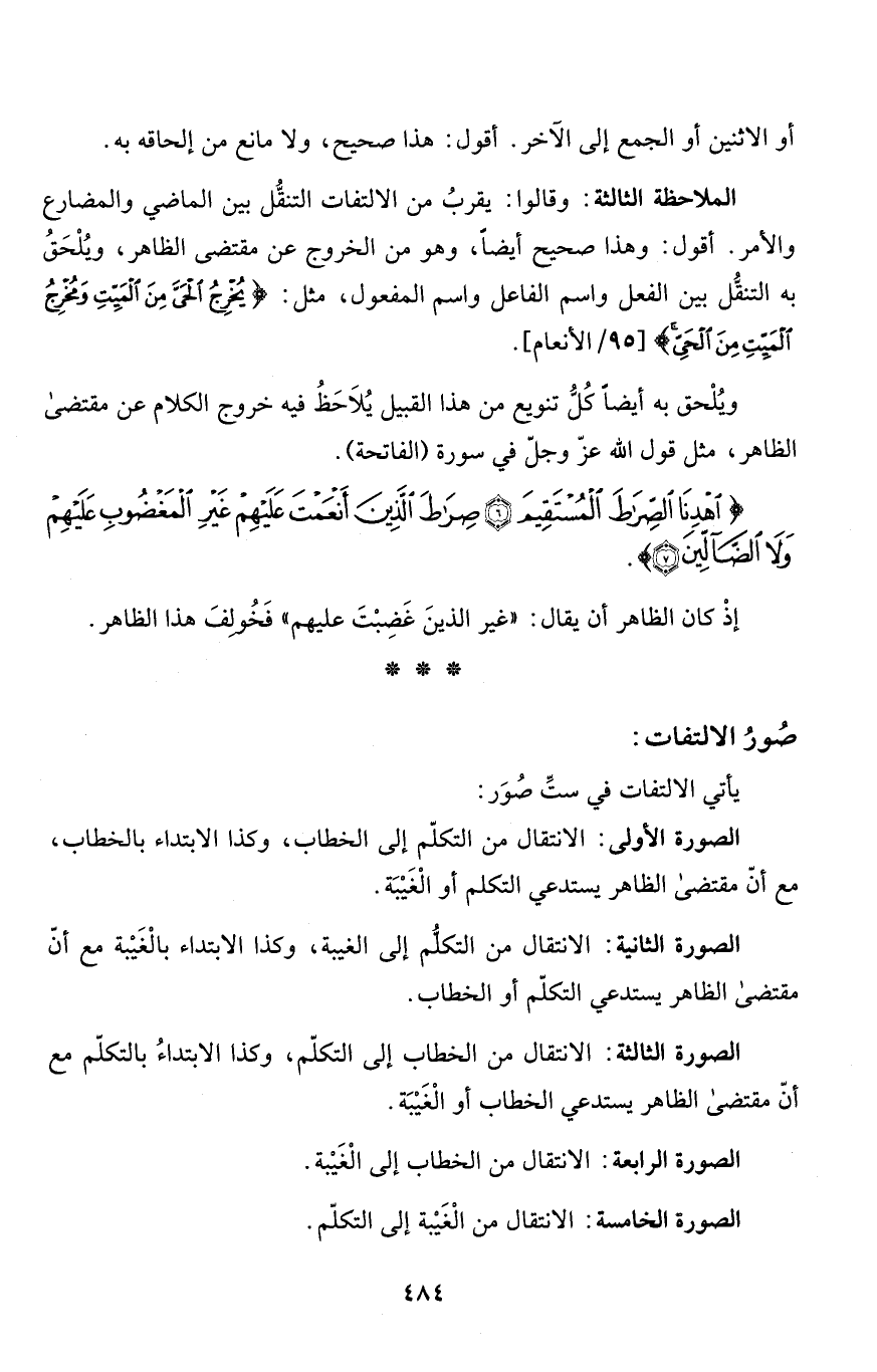 ويُلْحق به أيضاً كُلُّ تنويع من هذا القبيل يُلاَحَظُ فيه خروج الكلام عن مقتضى الظاهر، مثل قول الله عزّ وجلّ في سورة (الفاتحة) .