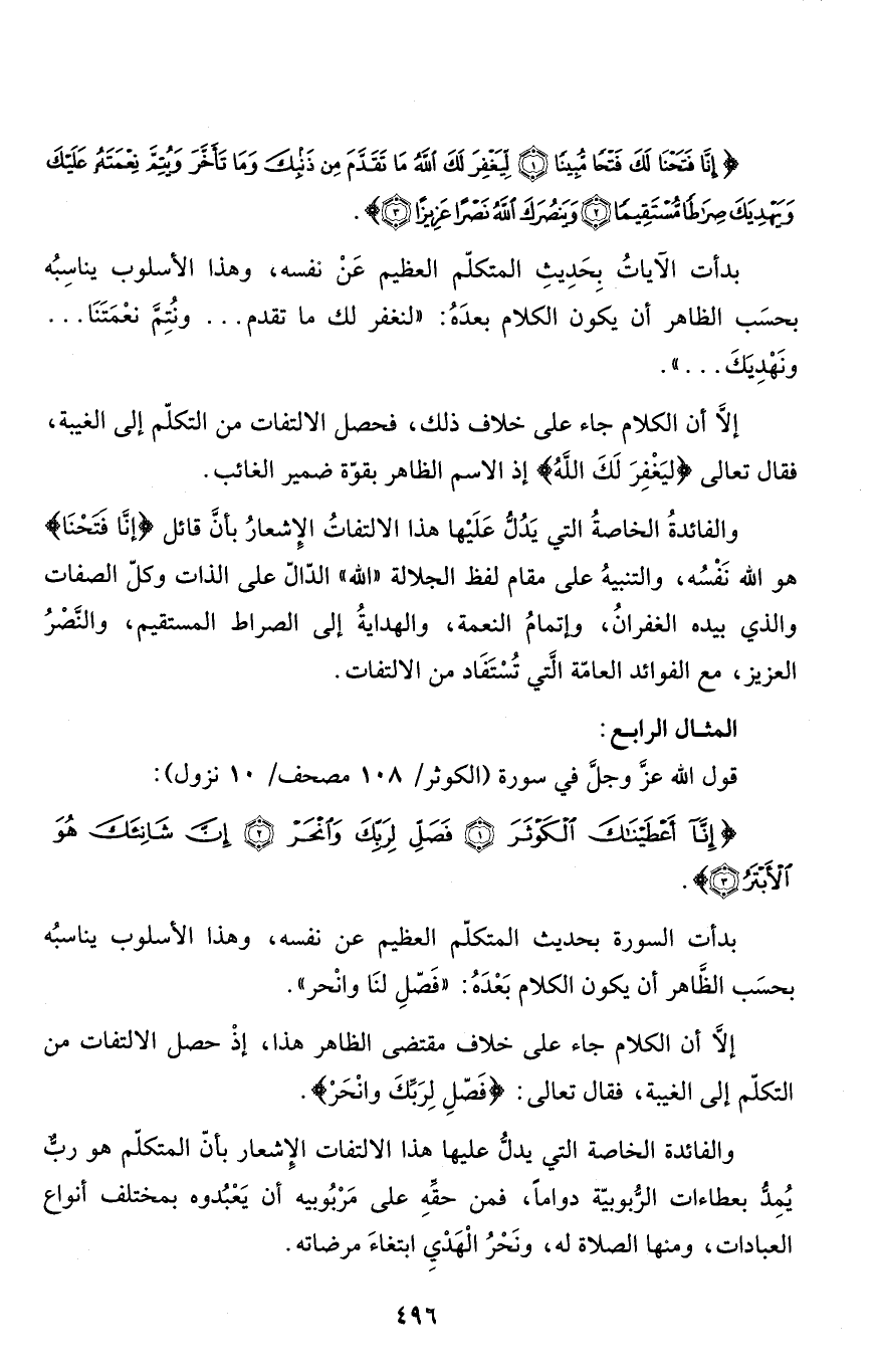 والفائدة الخاصة التي يدلُّ عليها هذا الالتفات الإِشعار بأنّ المتكلّم هو ربٌّ يُمِدُّ بعطاءات الرُّبوبيّة دواماً، فمن حقِّهِ على مَرْبُوبيه أن يَعْبُدوه بمختلف أنواع العبادات، ومنها الصلاة له، ونَحْرُ الْهَدْيِ ابتغاءَ مرضاته.