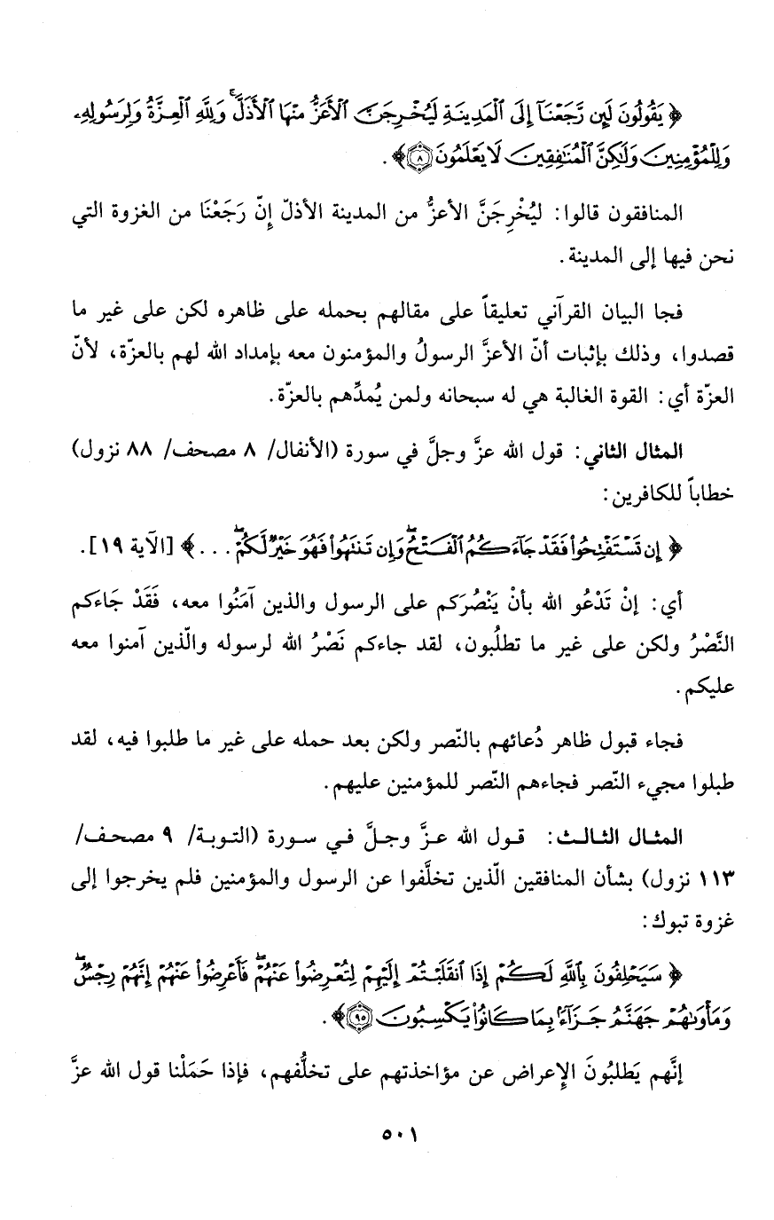 المثال الثالث: قول الله عزَّ وجلَّ في سورة (التوبة/ 9 مصحف/ 113 نزول) بشأن المنافقين الّذين تخلَّفوا عن الرسول والمؤمنين فلم يخرجوا إلى غزوة تبوك: