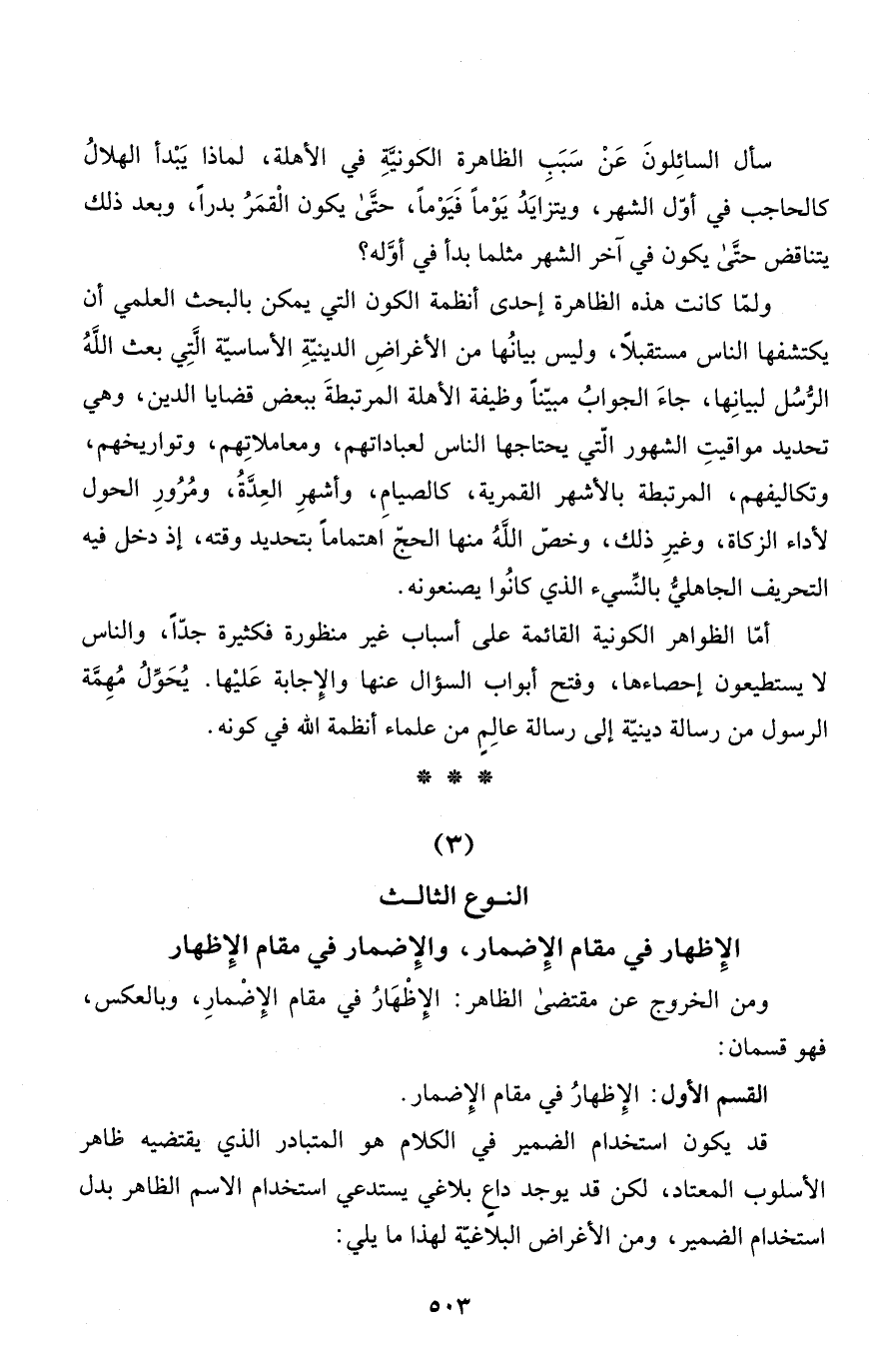ومن الخروج عن مقتضى الظاهر: الإِظْهَارُ في مقام الإِضْمارِ، وبالعكس، فهو قسمان: