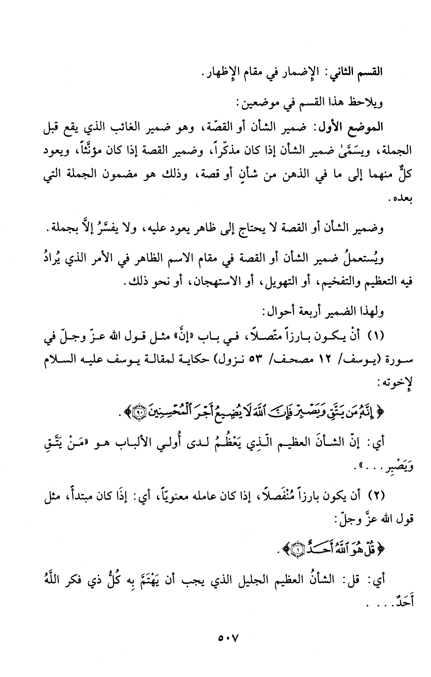 (1) أنْ يكون بارزاً متّصلاً، في باب "إنَّ" مثل قول الله عزّ وجلّ في سورة (يوسف/ 12 مصحف/ 53 نزول) حكاية لمقالة يوسف عليه السلام لإِخوته: