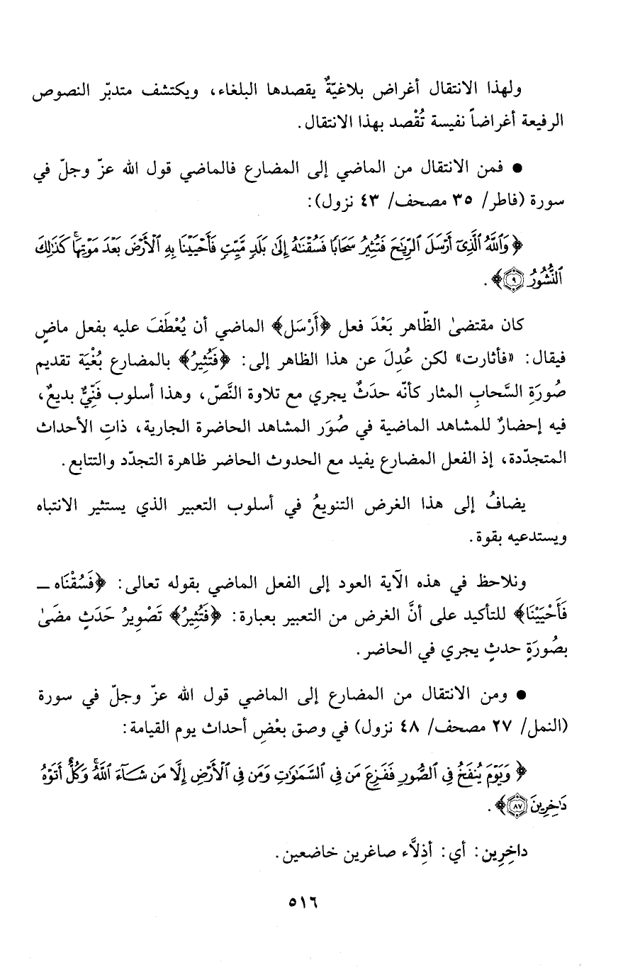 * ومن الانتقال من المضارع إلى الماضي قول الله عزّ وجلّ في سورة (النمل/ 27 مصحف/ 48 نزول) في وصق بعْضِ أحداث يوم القيامة: