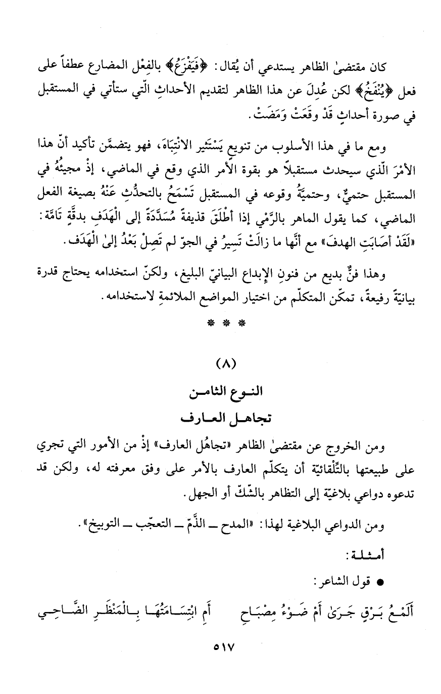 وهذا فنٌّ بديع من فنونِ الإِبداع البيانيّ البليغ، ولكنّ استخدامه يحتاج قدرة بيانيّةً رفيعةً، تمكّن المتكلّم من اختيار المواضع الملائمةِ لاستخدامه.