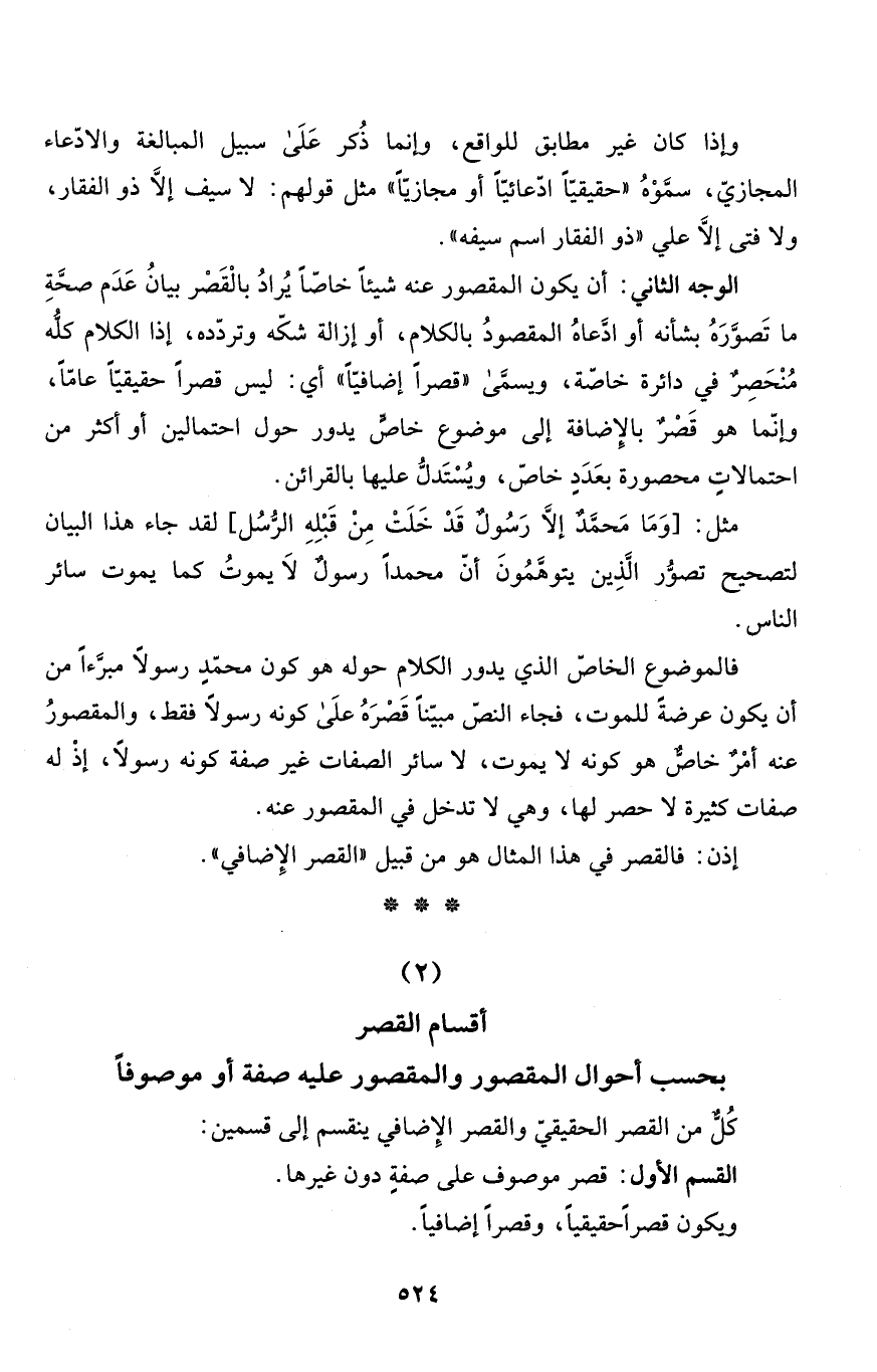 فالموضوع الخاصّ الذي يدور الكلام حوله هو كون محمّدٍ رسولاً مبرَّءاً من أن يكون عرضةً للموت، فجاء النصّ مبيّناً قَصْرَهُ علَى كونه رسولاً فقط، والمقصورُ عنه أمْرٌ خاصٌّ هو كونه لا يموت، لا سائر الصفات غير صفة كونه رسولاً، إذْ له صفات كثيرة لا حصر لها، وهي لا تدخل في المقصور عنه.