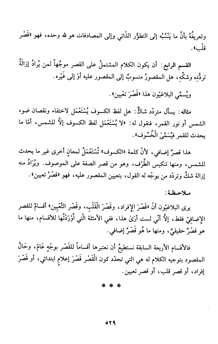 هذا قصرٌ إضافي، لأنّ كلمة "الكسوف" تُسْتَعْمَلُ لمعانٍ أخرى غير ما يحدث للشمس، ومنها تنكيس الطَّرْف، وهو من قصر الصفة على الموصوف. وُيرَادُ منه إزالة شكِّ وتردّد من يوجّه له القول بتعيين المقصور عليه، فهو "قصْرُ تعيين".