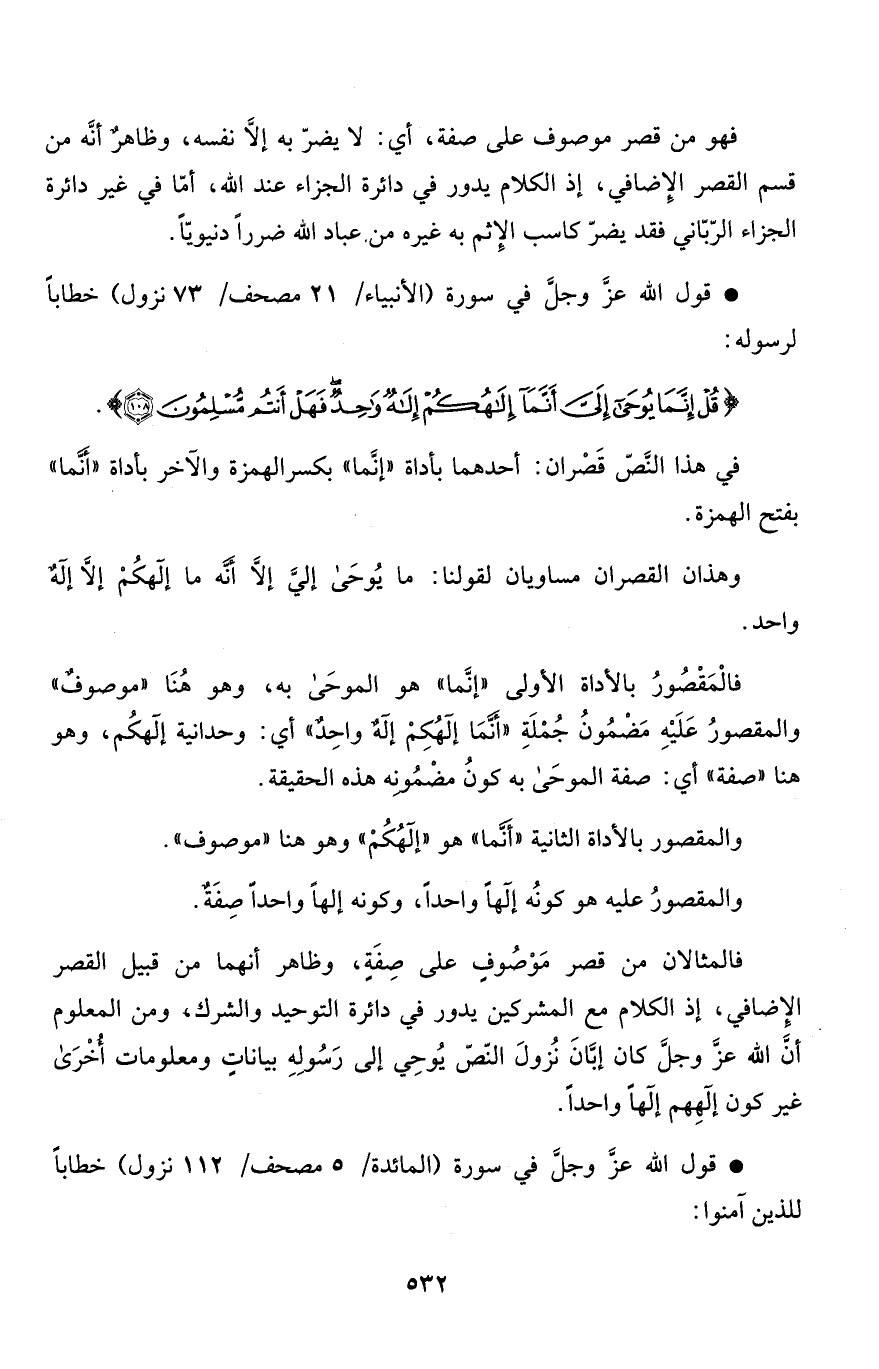 فالمثالان من قصر مَوْصُوفٍ على صِفَةٍ، وظاهر أنهما من قبيل القصر الإِضافي، إذ الكلام مع المشركين يدور في دائرة التوحيد والشرك، ومن المعلوم أنَّ الله عزَّ وجلَّ كان إبَّانَ نُزولَ النّصّ يُوحِي إلى رَسُولِهِ بياناتٍ ومعلومات أُخْرَى غير كون إلههم إلها واحداً.
