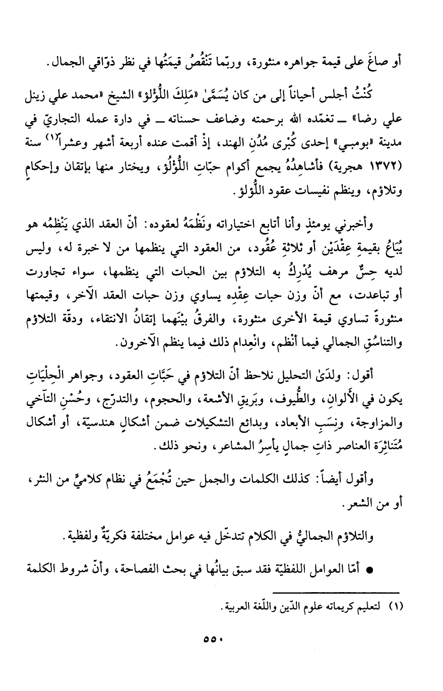 وأخبرني يومئذٍ وأنا أتابع اختياراته ونَظْمَهُ لعقود: أنّ العقد الذي يَنْظِمُه هو يُبَاعُ بقيمةِ عِقْدَيْن أو ثلاثةِ عُقُود، من العقود التي ينظمها من لا خبرة له، وليس لديه حِسٌّ مرهف يُدْرِكُ به التلاؤم بين الحبات التي ينظمها، سواء تجاورت أو تباعدت، مع أنّ وزن حبات عِقْدِه يساوي وزن حبات العقد الآخر، وقيمتها منثورةً تساوي قيمة الأخرى منثورة، والفرقُ بيْنَهما إتقانُ الانتقاء، ودقّة التلاؤم والتناسُقِ الجمالي فيما أنْظم، وانْعِدام ذلك فيما ينظم الآخرون.
