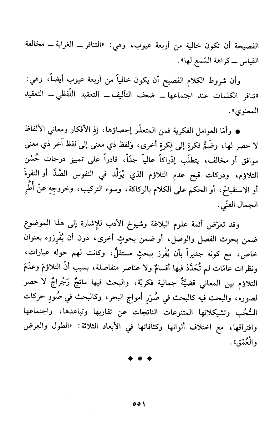 وأن شروط الكلام الفصيح أن يكون خالياً من أربعة عيوب أيضاً، وهي: "تنافر الكلمات عند اجتماعها - ضعف التأليف - التعقيد اللّفظي - التعقيد المعنوي".