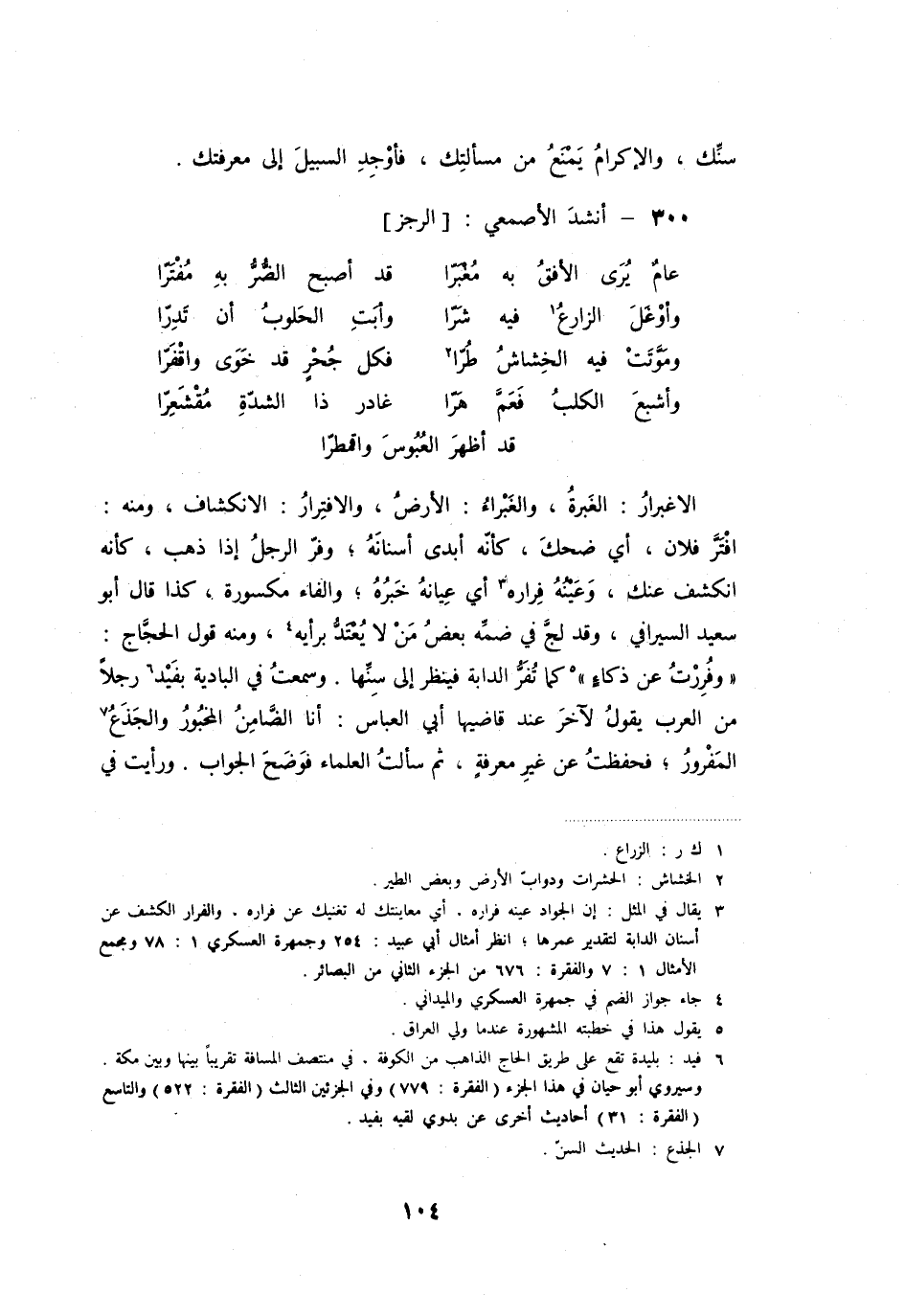 الأغبرار: الغبرة، والغبراء: الأرض، والأفترار: الأنكشاف، ومنه: أفتر فلان، أي ضحك، كأنه أبدى أسنانه؛ وفر الرجل إذا ذهب، كأنه انكشف عنك، وعينه فراره أي عيانه خبره؛ والفاء مكسورة، كذا قال أبو سعيد السيرافي، وقد لج في ضمه بعض من لا يعتد برأيه، ومنه قول الحجاج: وفررت عن ذكاء كما تفر الدابة فينظر إلى سنها. وسمعت في البادية بفيد رجلاً من العرب يقول لأخر عند قاضيها أبي العباس: أنا الضامن المخبور والجذع المفرور؛ فحفظت عن غير معرفة، ثم سألت العلماء فوضح الجواب. ورأيت في