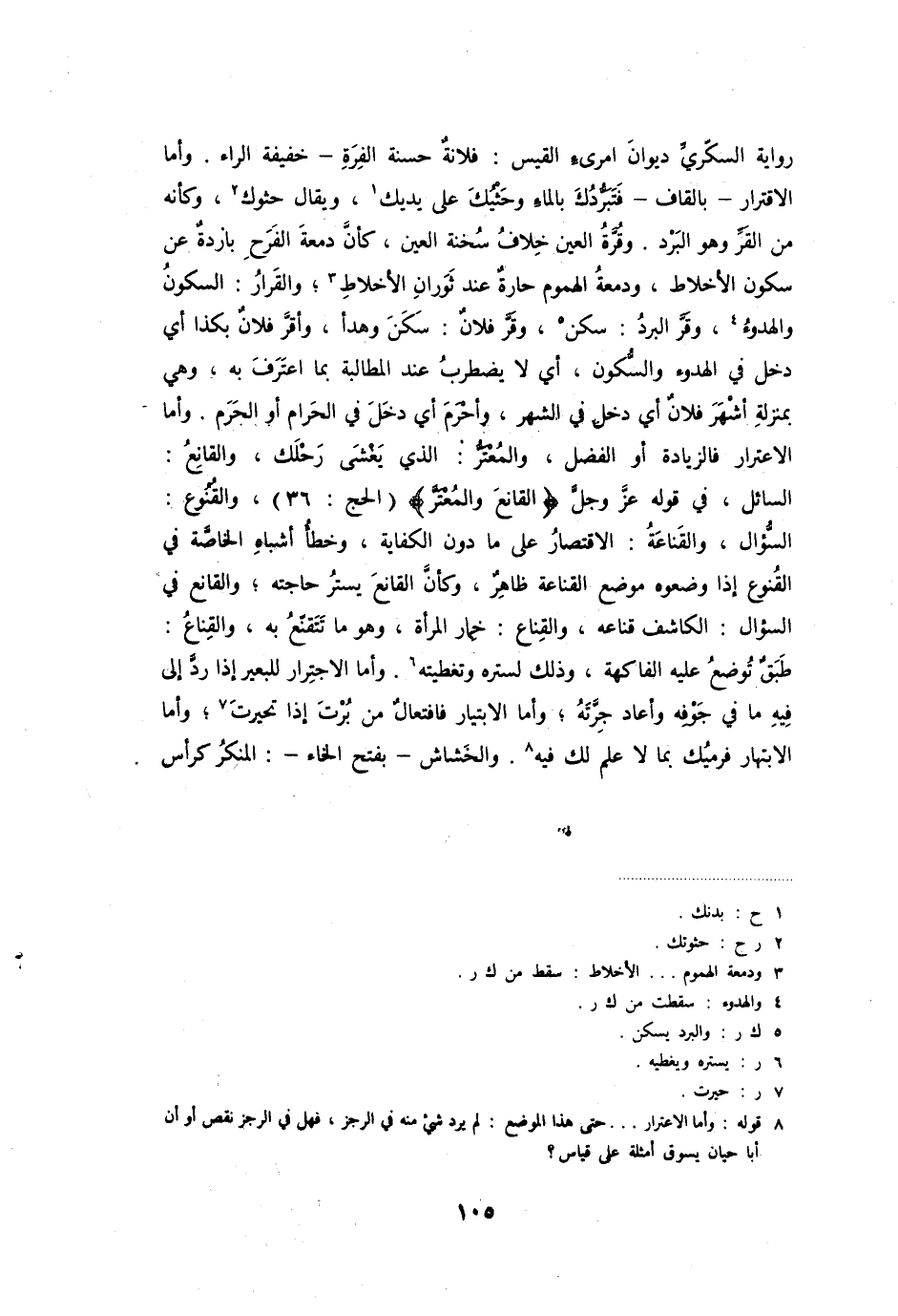 رواية السكري ديوان امرىء القيس: فلانة حسنة الفرة - خفيفة الراء. وأما الأقترار - بالقاف - فتبردك بالماء وحثيك على يديك، ويقال حثوك، وكأنه من القر وهو البرد. وقرة العين خلاف سخنة العين، كأن دمعة الفرح باردة عن سكون الأخلاط، ودمعة الهموم حارة عند ثوران الأخلاط؛ والقرار: السكون والهدوء، وقر البرد: سكن، وقر فلان: سكن وهدأ، وأقر فلان بكذا أي دخل في الهدوء والسكون، أي لا يضطرب عند المطالبة بما اعترف به، وهي بمنزلة أشهر فلان أي دخل في الشهر، وأحرم أي دخل في الحرام أو الحرم. وأما الاعترار فالزيادة أو الفضل، والمعتر: الذي يغشى رحلك، والقانع: السائل، في قوله عز وجل " القانع والمعتر " الحج: 36، والقنوع: السؤال، والقناعة: الاقتصار على ما دون الكفاية، وخطأ أشباه الخاصة في القنوع إذا وضعوه موضع القناعة ظاهر، وكأن القانع يستر حاجته؛ والقانع في السؤال: الكاشف قناعه، والقناع: خمار المرأة، وهو ما تتقنع به، والقناع: طبق توضع عليه الفاكهة، وذلك لستره وتغطيته. وأما الاجترار للبعير إذا رد إلى فيه ما في جوفه وأعاد جرته؛ وأما الابتيار فأفتعال من برت إذا تحيرت؛ وأما الابتهار فرميك بما لا علم لك فيه. والخشاش - بفتح الخاء -: المنكر كرأس