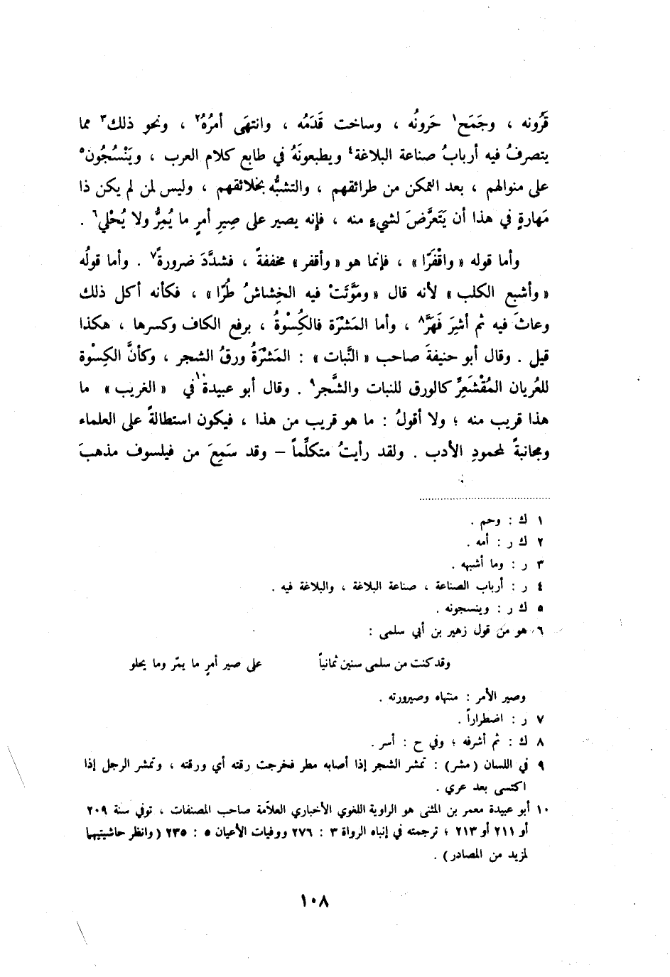 وأما قوله واقفرا، فإنما هو وأقفر مخففة، فشدد ضرورة. وأما قوله وأشبع الكلب لأنه قال وموتت فيه الخشاش طرا، فكأنه أكل ذلك وعاث فيه ثم أشر فهر، وأما المشرة فالكسوة، برفع الكاف وكسرها، هكذا قيل. وقال أبو حنيفة صاحب النبات: المشرة ورق الشجر، وكأن الكسوة للعريان المقشعر كالورق للنبات والشجر. وقال أبو عبيدة في الغريب ما هذا قريب منه؛ ولا أقول: ما هو قريب من هذا، فيكون استطالة على العلماء ومجانبة لمحمود الأدب. ولقد رأيت متكلماً - وقد سمع من فيلسوف مذهب