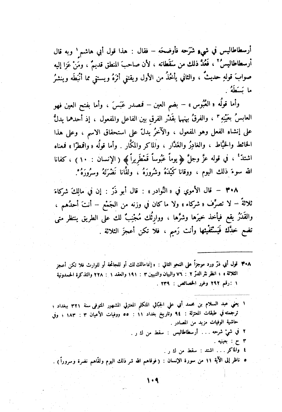 أرسطاطاليس في شيء شرحه فأوضحه - فقال: هذا قول أبي هاشم وبه قال أرسطاطاليس، فعد ذلك من سقطاته، لأن صاحب المنطق قديم، ومن عزا إليه صواب قوله حديث، والثاني يأخذ من الأول ويقتفي أثره ويستقي مما أنبطه وينشر ما بسطه.